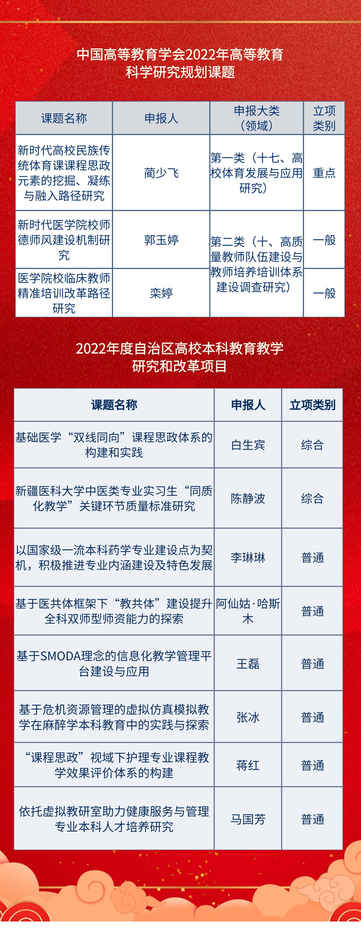 近日,中国高等教育学会、自治区教育厅相继公布了“中国高等教育学会2022年高等教育科学研究规划课题立项名单”、“2022年度自治区高校本科教育教学研究和改革项目立项名单”,beat365共有11个项目获批立项。其中,“高等教育科学研究规划课题”获得立项3项,重点项目1项,一般项目2项;“自治区高校本科教育教学研究和改革项目”获立8项,综合项目2项,普通项目6项。