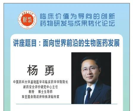 中国药科大学基础医学与临床药学学院院长、新药安全评价研究中心主任杨勇教授以“国际前沿生物医药技术”为主题,介绍了生物经济时代和生物革命时代下,面前世界前沿的创新生物药发展趋势和前沿生物技术,强调要在复杂和严峻的国际关系背景下,顶层设计,统筹布局中药、化学和细胞药物的研发。