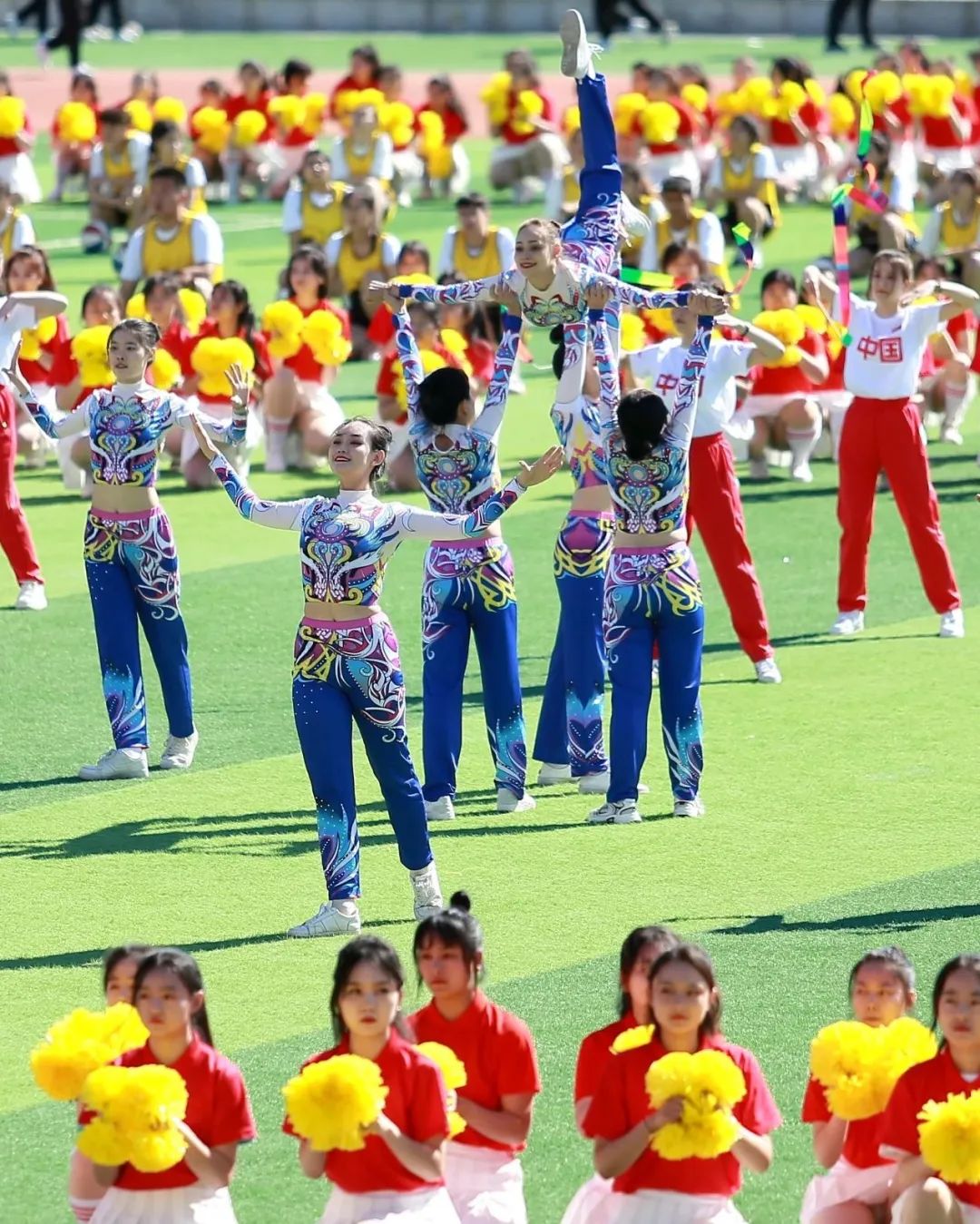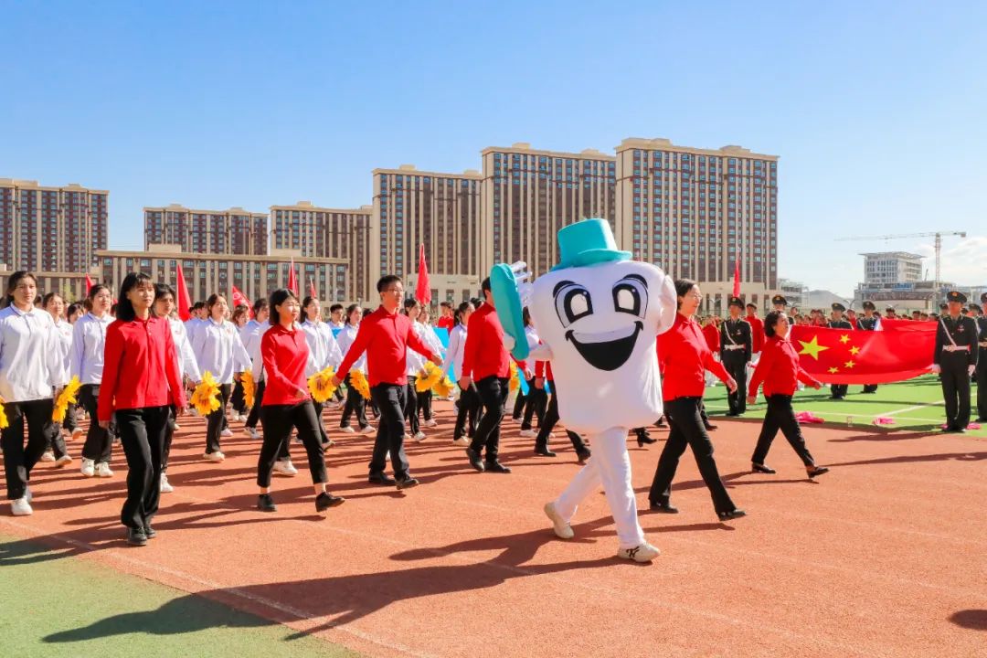 上午10点,运动会开幕式正式开始。在现场7000多名师生热烈的欢呼声中,国旗仪仗队、校旗队、红旗队引领着全校各单位、各学院组成的方队步伐整齐、精神抖擞地步入赛场。在行进到主席台前时,各学院展示了体现学院特色的精彩短节目,引得观众席爆发出一阵阵呐喊、助威声。瞬间,开幕式现场的气氛达到了高潮。