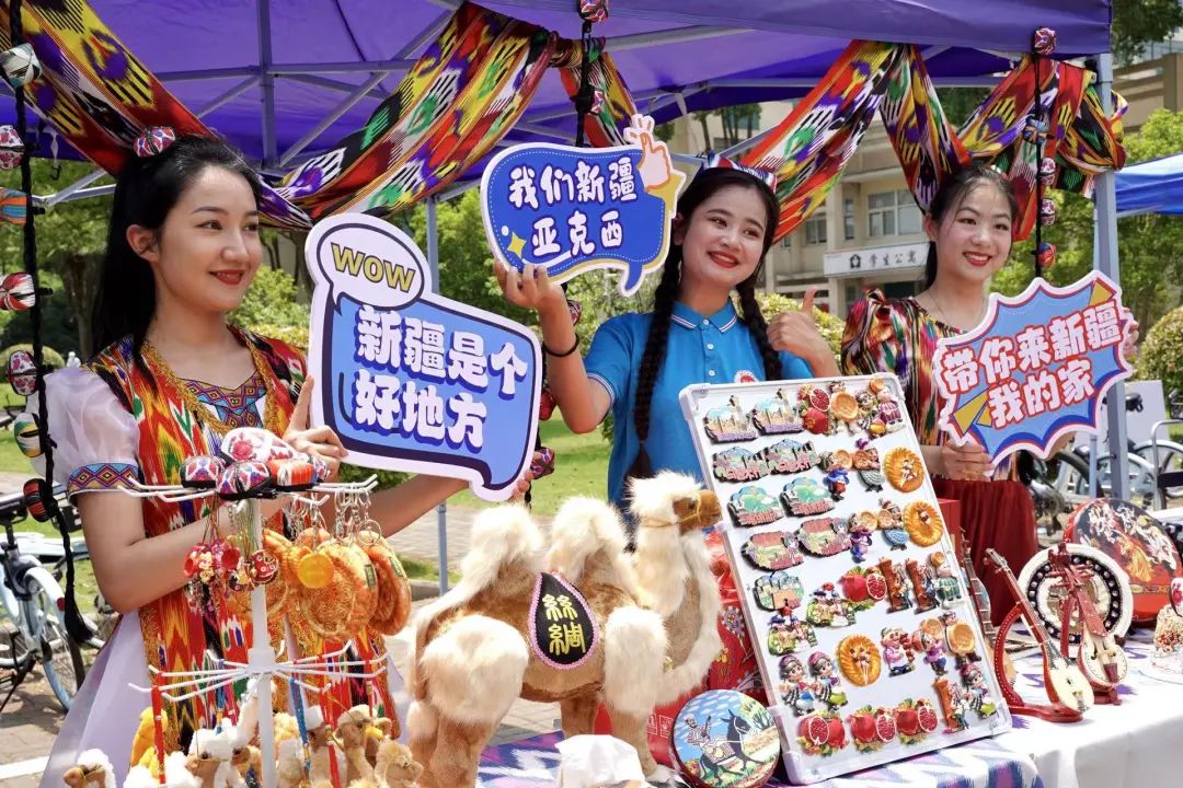 实践团在南医校园开展了新疆文创产品展示、民族特色服饰换装、品尝新疆特色干果、文艺演出等活动,吸引了南医师生的热情参与。实践团队员共同担任“大美新疆”宣传员、“美食新疆”推荐员、“文创新疆”展示员,向南医师生展示新疆风光、新疆文化,一同感受新疆的风土人情,谱写了新时代的民族团结之歌。