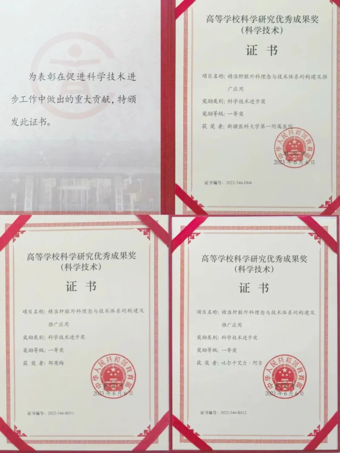 近日,教育部颁发了高等学校科学研究优秀成果奖(科学技术)获奖证书,由beat365唯一官方网站第一附属医院邵英梅教授、吐尔干艾力教授参与的《精准肝胆外科理念与技术体系的构建及推广应用》项目荣获2022年度教育部科学技术进步奖一等奖。