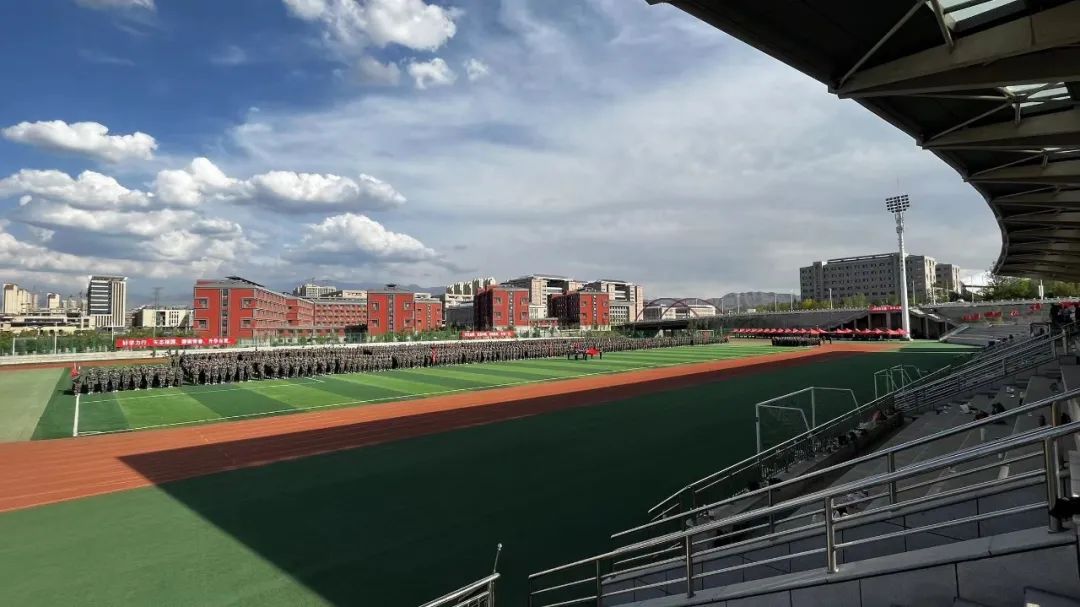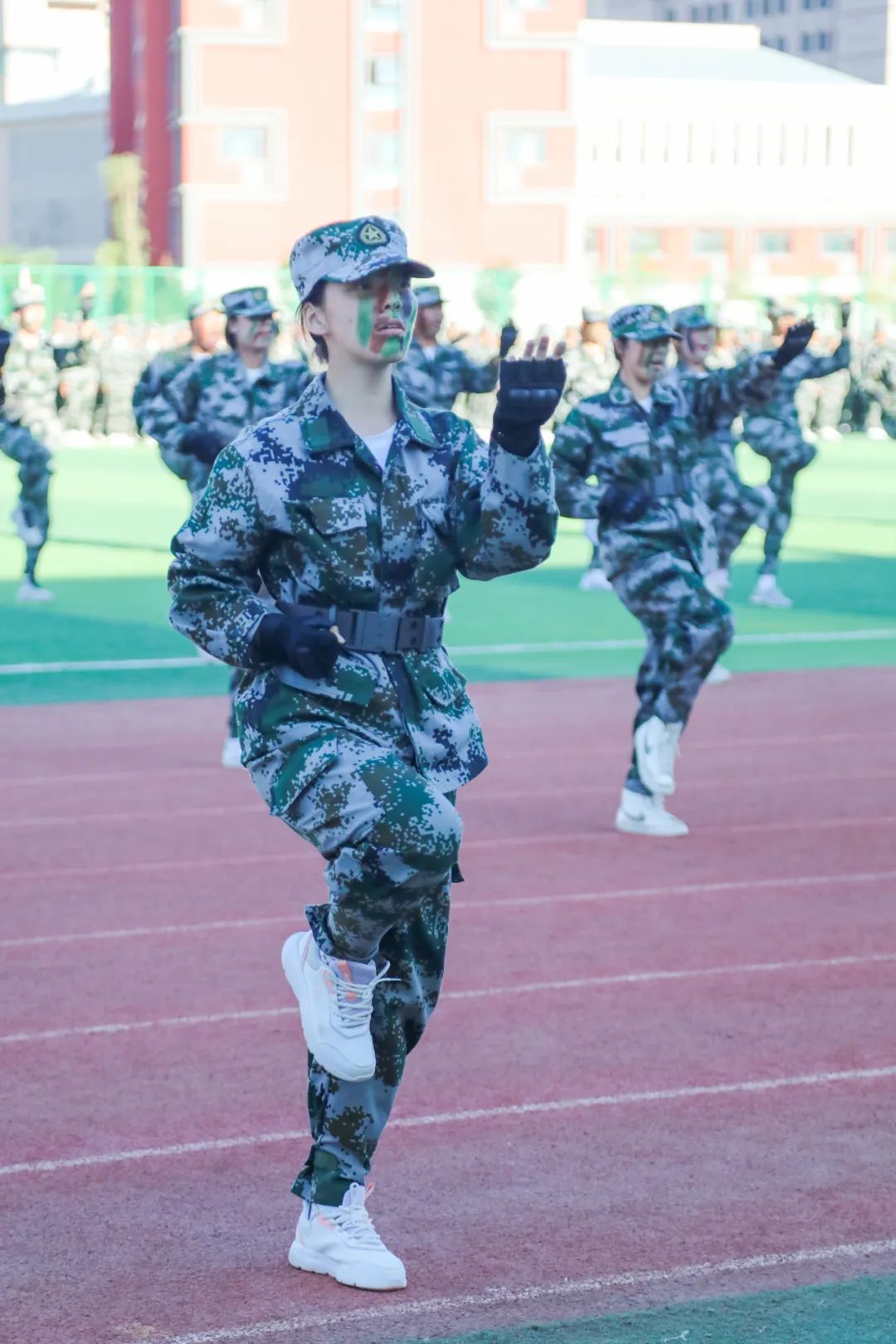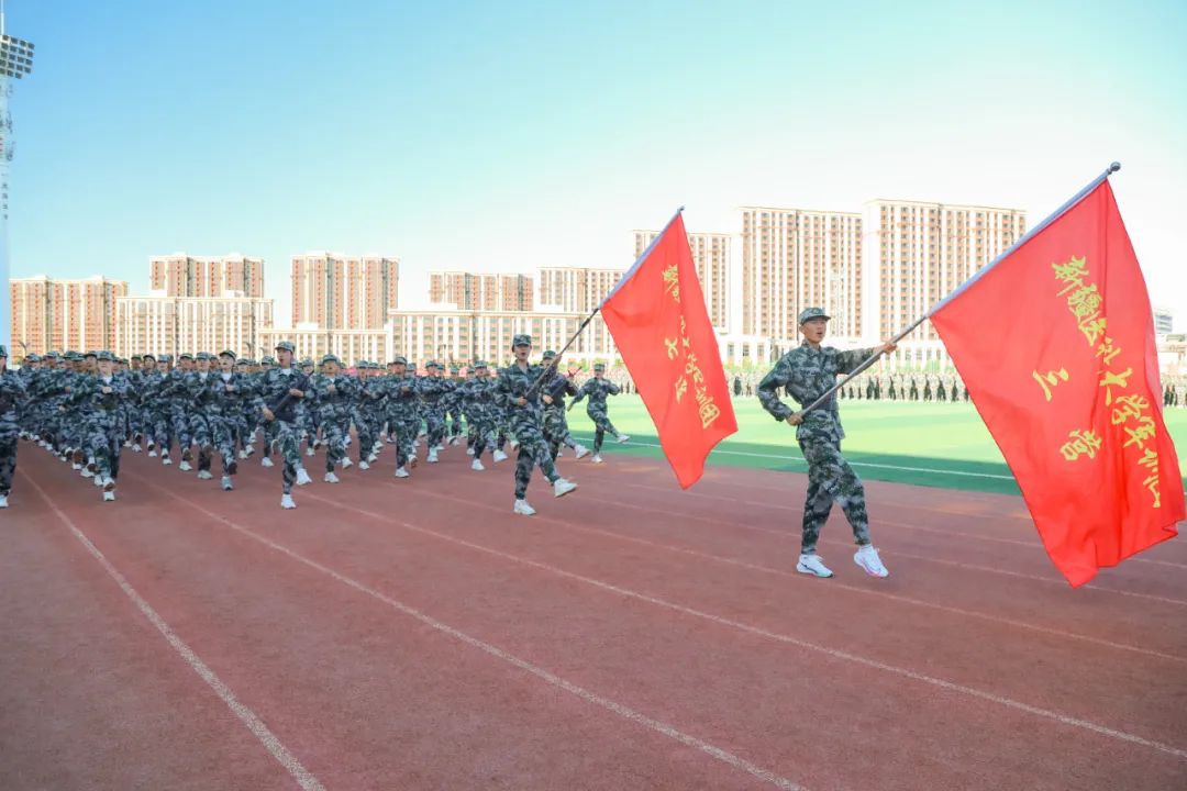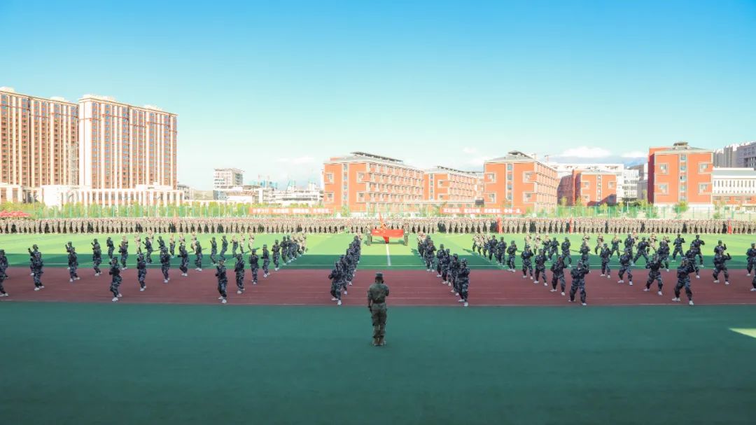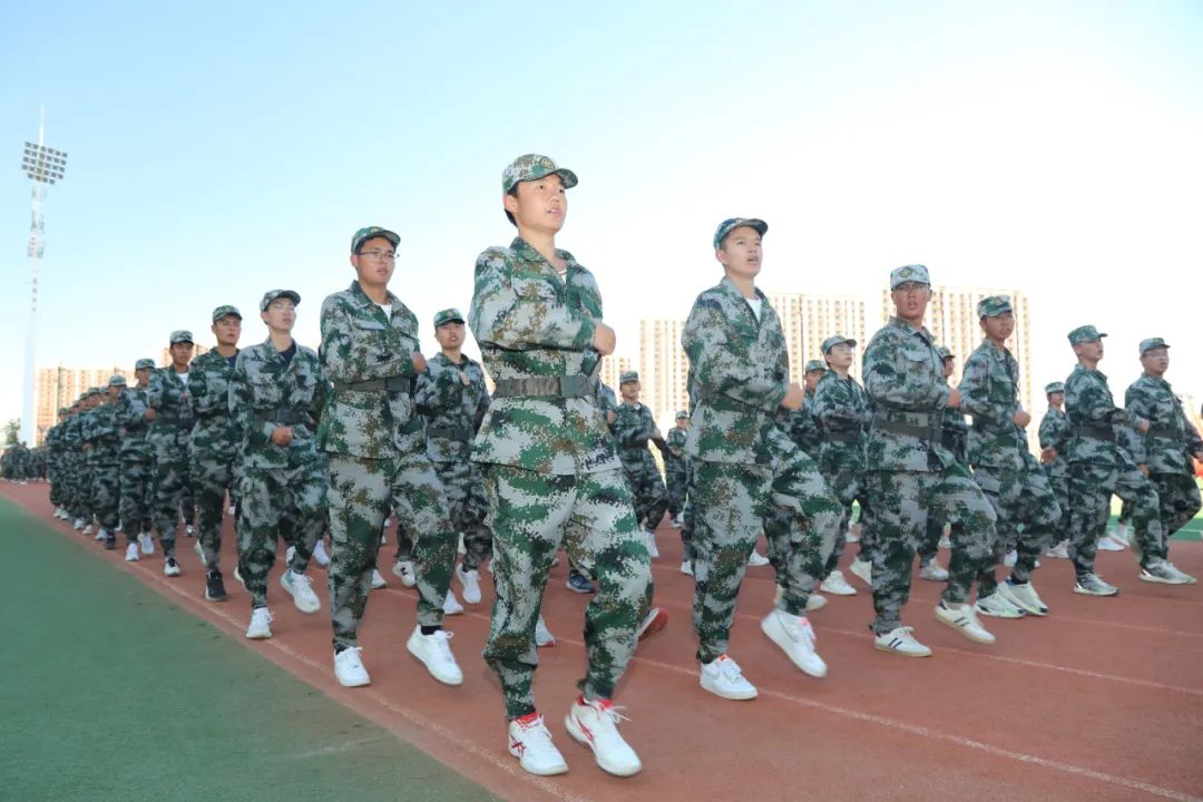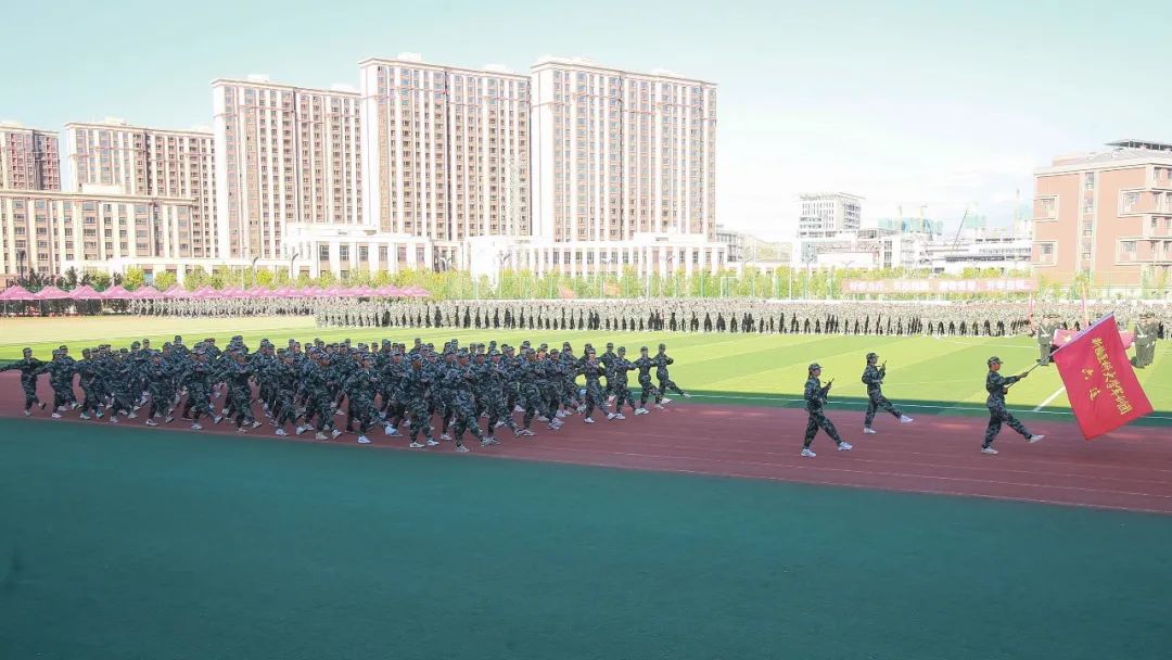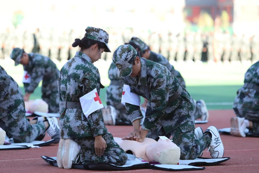 在国旗班的带领下,由全体参训学生组成的10个连37个训练方队排列整齐、有序进场,接受检阅。青春的面庞晒得黝黑,但同学们朝气蓬勃、目光如炬、步伐坚定,激昂的口号声响彻整个运动场。参训队伍表演了军体拳演练,医疗救护连展示了护理急救的训练成果,展现出新时代青年奋发有为、昂扬向上的精神风貌。