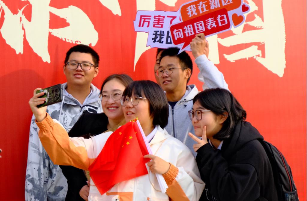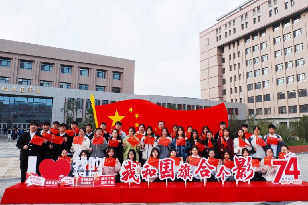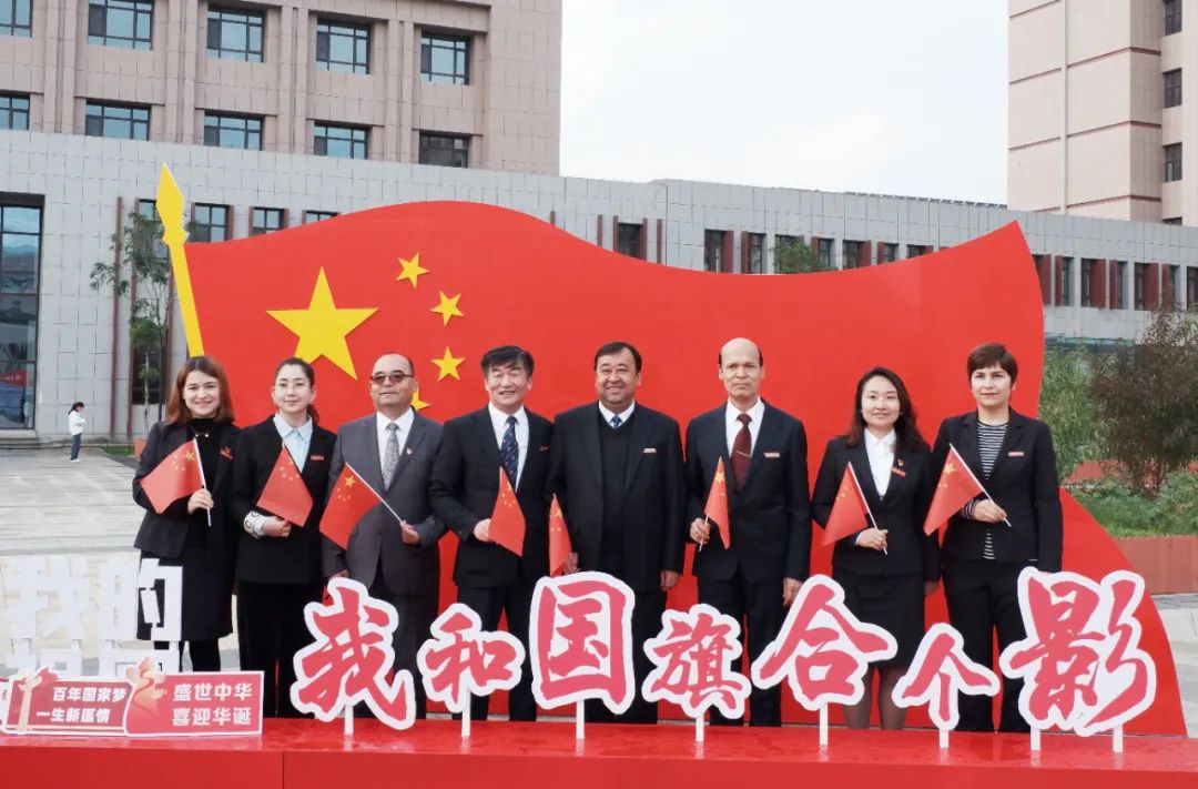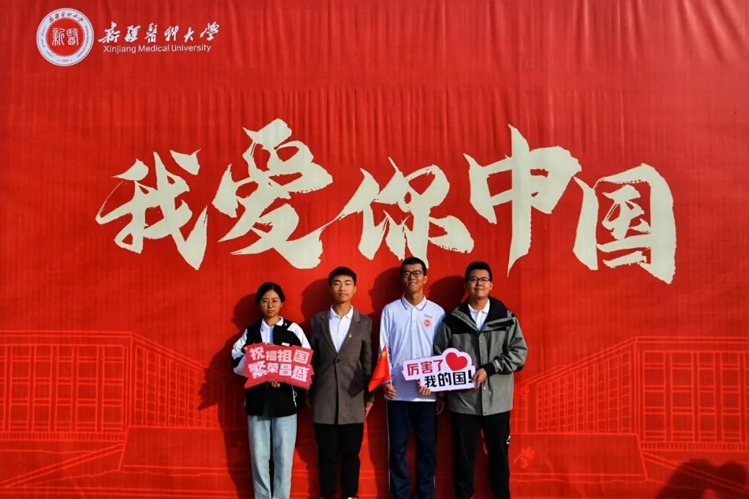 国旗下,新医师生代表马莉、胡博文、刘宜坤、迪丽菲茹孜·玉苏甫江代表全校师生向祖国母亲献词——金秋里的中国,表达对伟大祖国最深沉的热爱和美好祝福,抒发新医学子以“强国一代”的崭新风貌奋勇前行,奋力书写无愧于国家、无愧于时代、无愧于未来的青春华章的坚定决心!