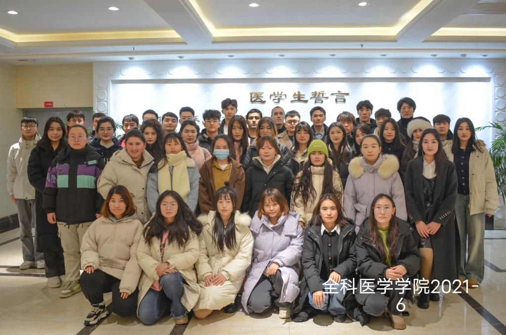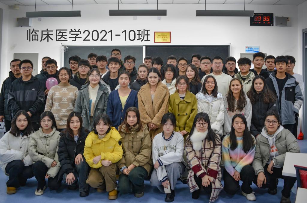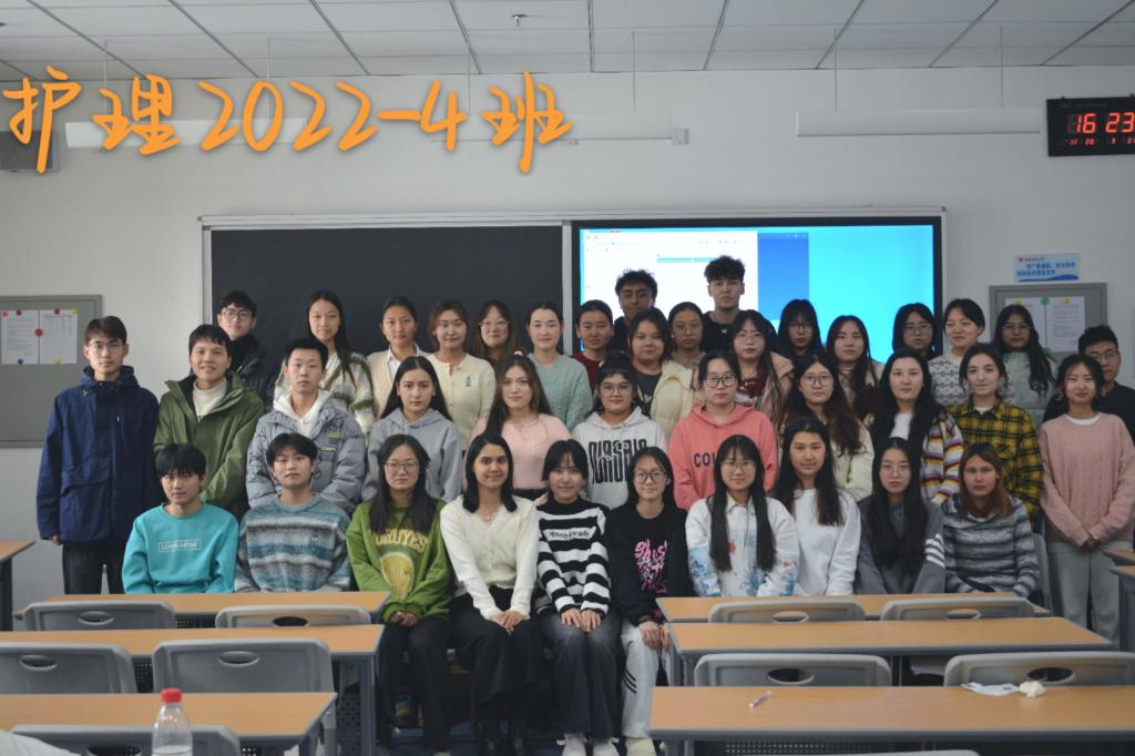 临床医学专业(免费医学生)2022-4班,共有57名同学,入党积极分子3名,共青团员33名。这是一个民族团结大家庭,同学之间团结互助,勤奋好学,班风良好,56人全部递交了入党申请书。班级成立了学习小组,一学年共开展40余次小组学习,以强带弱,形成好学、刻苦、严谨的学风。2022-2023学年全班平均学习成绩居年级第一。班级全体同学将继续脚踏实地,以青春之名,唱响青春之歌,在建设新疆基层卫生健康事业中绽放绚丽的青春之花。