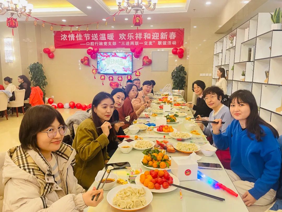 口腔医学院开展了“浓情佳节送温暖,欢乐祥和迎新春”三进两联一交友师生联谊活动,师生一同做游戏、表演节目、吃团圆饺子,温暖、欢快、祥和的节日气氛流淌在歌声里,融化在味蕾中,让留校学生感受到浓浓的年味儿和“家”的温暖。
