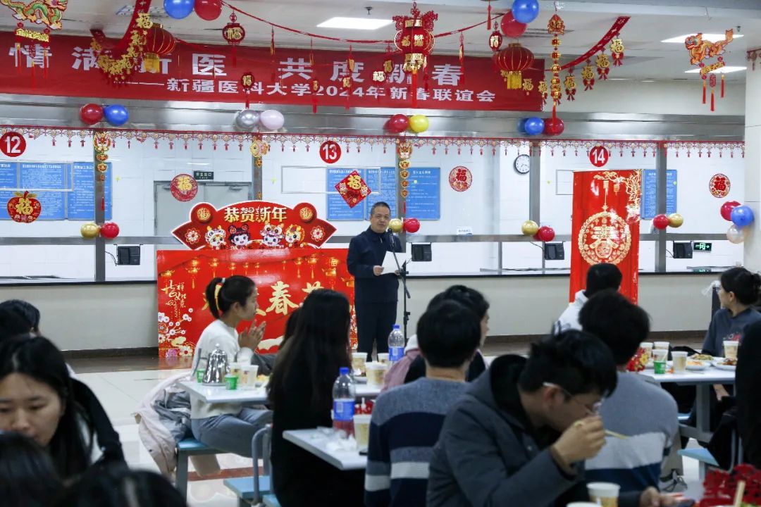 新春联谊会现场年味十足,餐厅内吉祥的“福”字,火红的中国结,无不洋溢着欢乐祥和的节日氛围。校党委副书记李剑峰在新年致辞中代表学校向同学们致以新年的问候和美好的祝福。学生阿卜杜萨拉木·图尔荪麦麦提代表留校学生,对学校的关心与陪伴表达感谢,并表示将常怀感恩、珍惜时光、努力奋斗,做一个有担当、有责任心的好学生、好医生。当晚,师生一起包饺子、畅聊生活、互送祝福,学校还为同学们准备的贴心的年夜饭,师生在欢声笑语间品味新春,共同迎接农历甲辰龙年的到来。