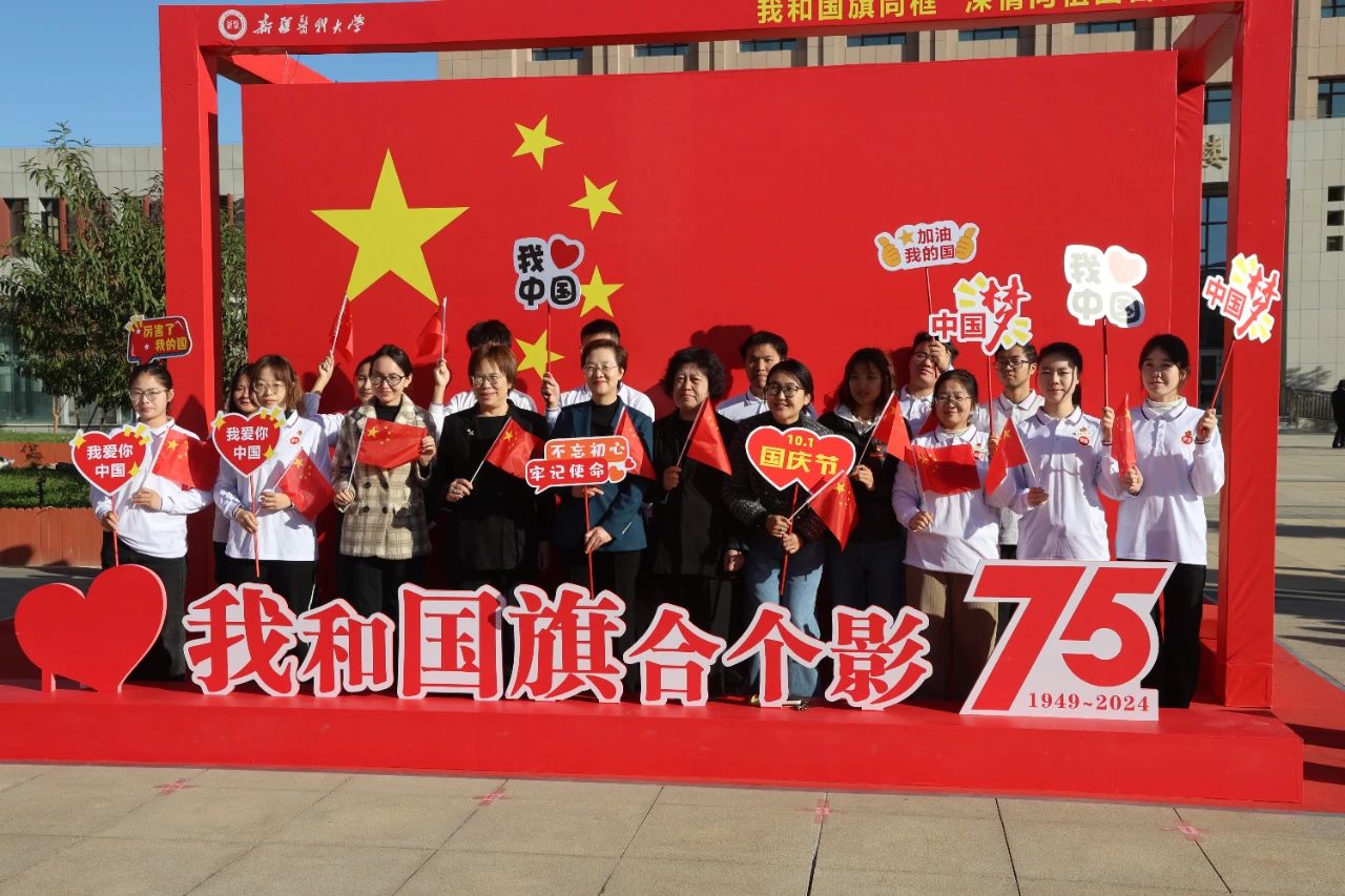 在迎风飘扬的五星红旗下,新医教师代表,药学院的李新霞教授、附属肿瘤医院的雷程副主任医师,和新医学生代表,中医学院的孙开元同学、维吾尔医学院的凯地日耶·阿不都为力同学,共同为国旗献词,表达了新疆各族儿女践行胡杨精神,扎根边疆、奉献祖国的坚定与赤诚,为实现中华民族伟大复兴的中国梦而努力奋斗的坚强决心!