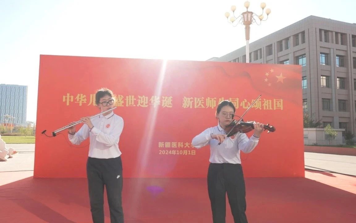 随后,新医学子演奏起优美的旋律,悠扬的小提琴和单簧管的音乐声响起,奏响了《我和我的祖国》的序曲,新医师生代表用饱含深情的歌唱,带领现场全体师生们一同高唱《我和我的祖国》,用真挚的歌声抒发对伟大祖国的美好祝福和建设美丽新疆的坚定信心。