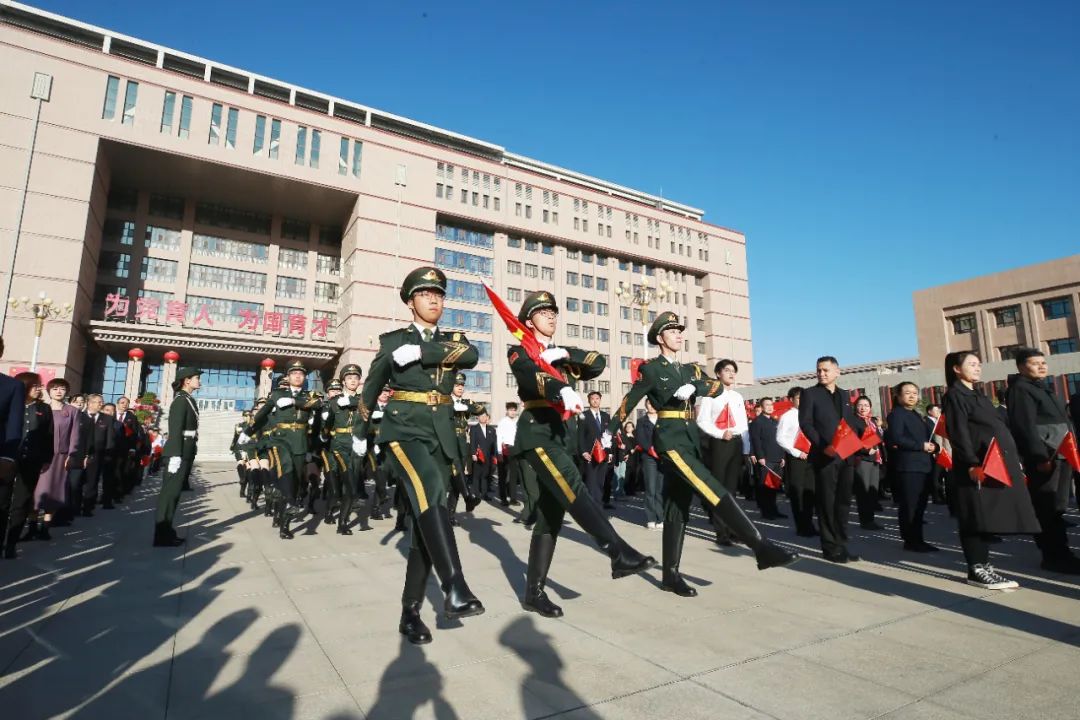 上午10时整,新医师生们手持红旗,在芳林广场上列队完毕。升旗仪式开始,国旗班的队员们一身戎装,迈着铿锵有力的步伐,护送国旗走向升旗台。