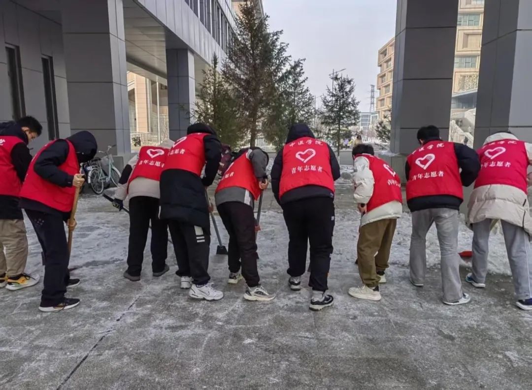 中医学院青年志愿者协会举办“三月春风暖人心 · 雷锋精神永传承”主题系列活动。十余名志愿者身着红马甲在学校开展“美丽校园”除冰行动,大家用雪铲、钢铲等工具清除校园的积雪,保障师生安全通行。当岐黄仁心遇上志愿红,他们不仅为校园除冰扫尘,更淬炼了医者仁心的精神底色。