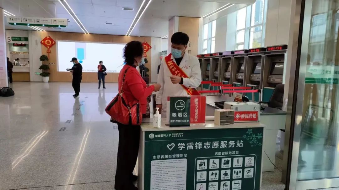 第三附属医院(第三临床医学院)门诊志愿者,从早上九点准时出现在门诊楼宇的各个岗位。志愿者们主动为就诊患者提供帮助,就诊指引、解疑答惑、帮助挂号,认真负责地解决每一位有需求的就诊患者,以实际行动展现了新时代的文明风尚。