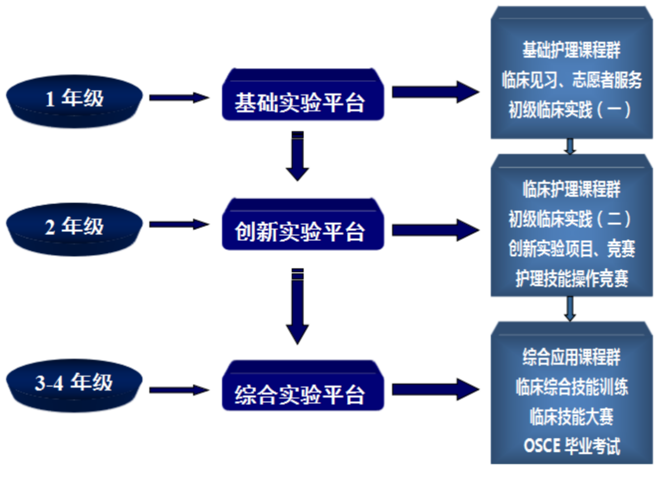 在课程计划中构建“早临床-重应用-兼创新”立体化实践教学模式,形成“基础、设计、综合”三阶段多层次的实验教学体系。模式设置为:一年级学生的基础实践技能训练,建立初步的护理观;二年级学生的初步临床技能训练与创新创业能力培养;三、四年级学生的临床护理综合能力训练与科研能力培养,锻炼临床思维及科学分析解决问题的能力。构建的教学成果《现代护理教育背景下实验教学中心建设与成效》获校级教学改革成果二等奖。在该模式的培养下,4名学生荣获第十届中国大学生医学技术技能大赛护理学专业赛道西南西北赛区团体三等奖;2名学生分别荣获全国第一届职业技能新疆地区选拔赛二等奖、三等奖;2名同学分别荣获国家人社部举办的三区三州职业技能大赛老年护理技能比赛银奖、铜奖;4名学生荣获全国第二届本科护理操作技能大赛三等奖。