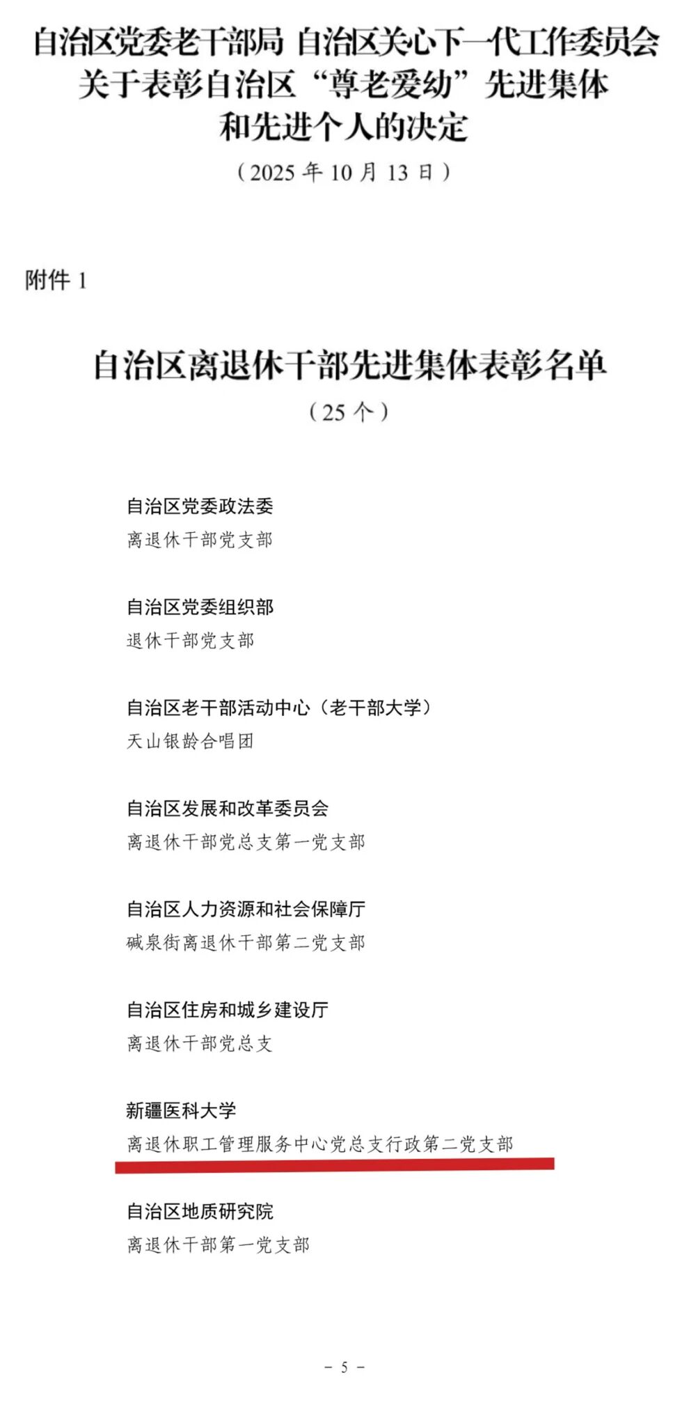近日,自治区党委老干部局、自治区关心下一代工作委员会授予 25 个集体 “自治区离退休干部先进集体” 称号,beat365唯一官方网站离退休职工管理服务中心党总支行政第二党支部获此殊荣。