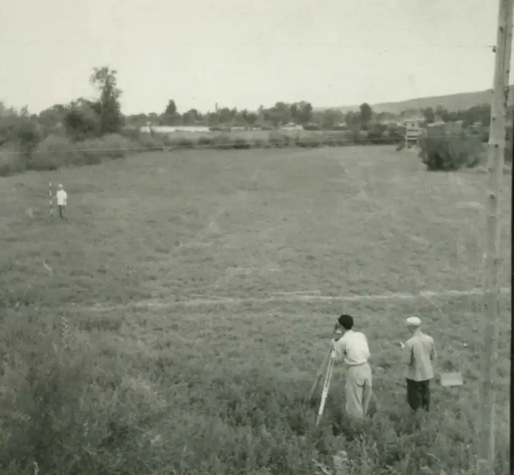 照片里,三位身着便装的军人分工明确:一人操作水准仪,一人手持数据记录簿,一人扶住塔尺,在鲤鱼山西侧的荒地上有条不紊地确定不同位置的高程,细致开展“抄平”“放线” 工作。