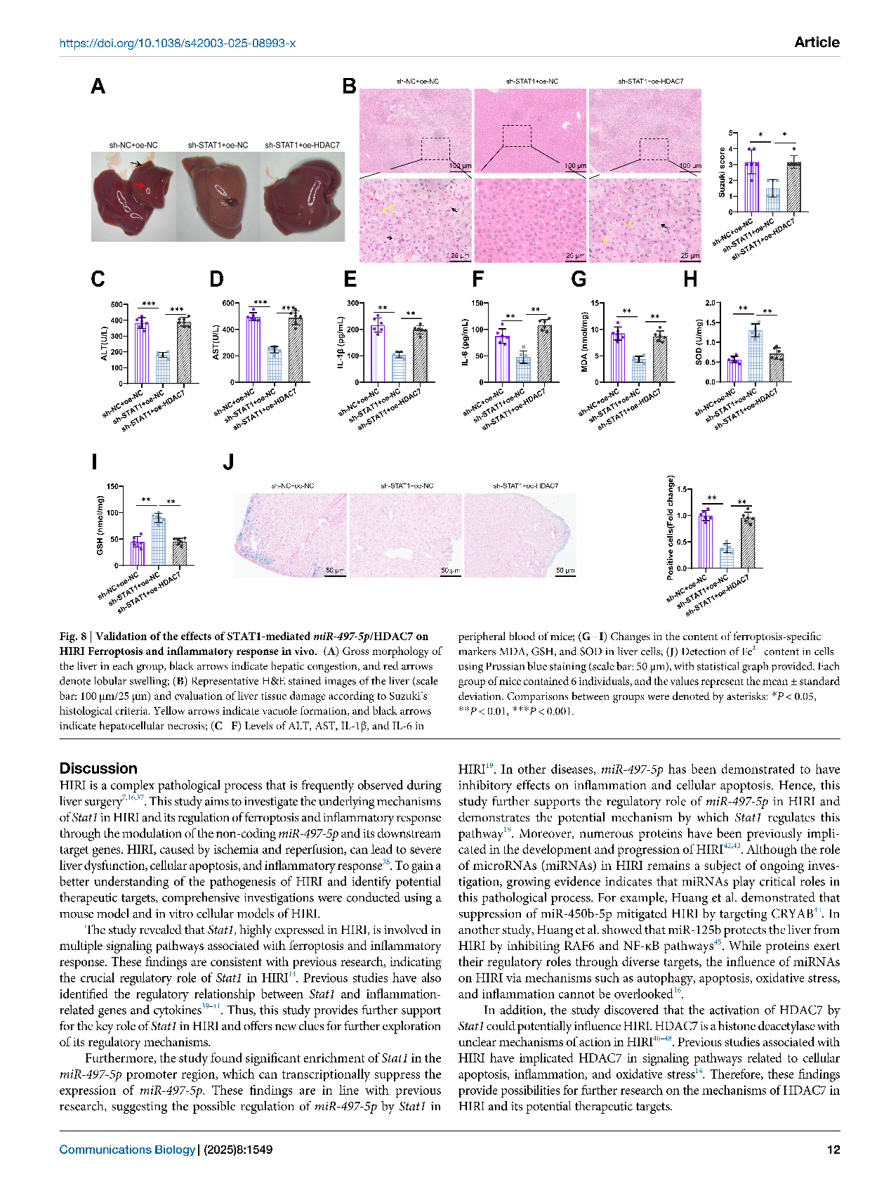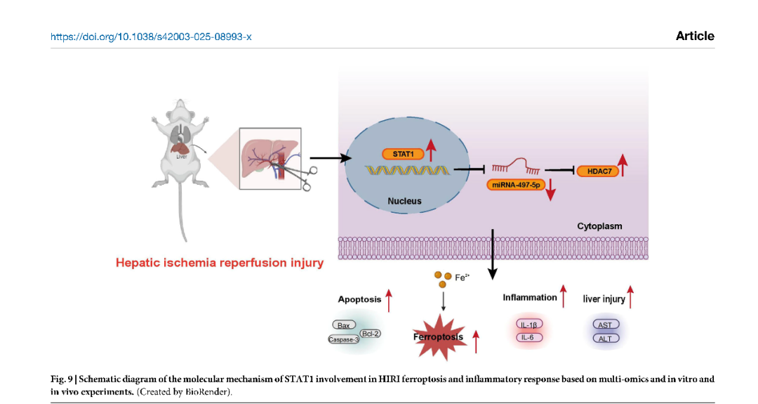 这项研究聚焦于“肝脏缺血再灌注损伤”——这是肝切除、肝移植等手术中常见且危险的并发症。简单来说,就是当肝脏在手术中暂时缺血,恢复供血后反而可能引发更严重的损伤。虽然科学家们已经知道“铁死亡”(一种铁依赖性的细胞死亡方式)在其中扮演重要角色,但具体是哪些分子在背后“操控”这一过程,仍不明确。围绕这一关键科学问题,研究团队通过分析小鼠的肝组织样本,锁定了一个关键分子——STAT1。研究团队以信号转导与转录激活因子1(STAT1)为切入点,通过转录组、蛋白组、细胞模型和小鼠模型的多层验证,深入解析STAT1于肝脏缺血再灌注损伤中的病理作用。他们发现,在肝脏缺血再灌注损伤过程中,STAT1的含量明显上升,并且会“压制”另一个名为miR-497-5p的分子。这种压制导致去乙酰化酶HDAC7活跃起来,进而推动铁死亡的发生、加剧炎症反应,最终造成肝细胞损伤。