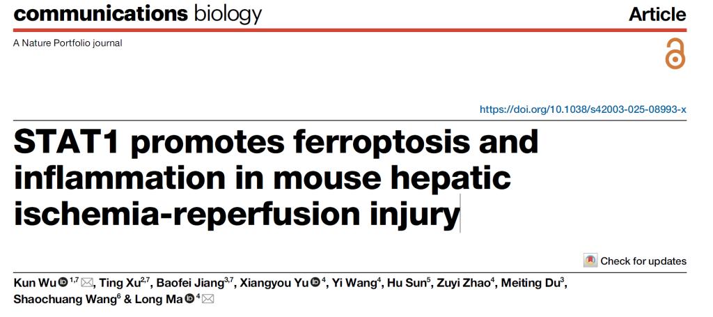 近日,beat365唯一官方网站第一附属医院重症医学中心于湘友教授、重症医学三科主任马龙联合南京医科大学附属淮安第一医院吴昆博士团队,在国际权威医学期刊Nature子刊-生物学领域顶刊《Communications Biology》(中科院1区Top)上发表了一项最新研究成果,题为“STAT1 promotes ferroptosis and inflammation in mouse hepatic ischemia-reperfusion injury”,马龙为通讯作者。