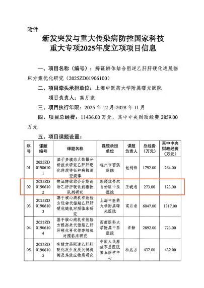 王晓忠教授团队参与并主持《辨证辨体结合分期论治法乙肝肝硬化前瞻性队列研究》,不仅优化乙肝肝硬化的中医诊疗方案,同时针对性构建适合新疆地区的肝病防治体系,助力降低肝硬化失代偿率与肝癌转化率,让国家级科研资源精准赋能新疆民众健康。国家科技重大专项作为聚焦国民经济和社会发展关键领域、攻克重大科技难题的国家级科研计划,此次将乙肝肝硬化中西医结合防治研究纳入支持范畴,正是着眼于其重大的民生价值与科研价值。