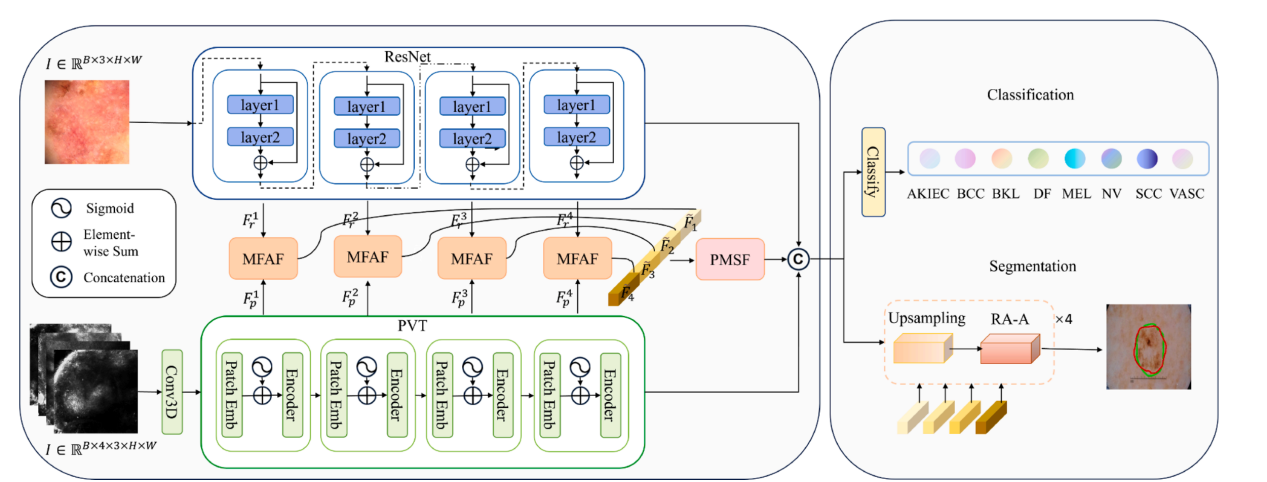 计算机辅助诊断(CAD)是皮肤病学研究的热点,尤其在实现病灶分类与分割等多任务联合诊断方面。然而,现有模型常面临特征融合不足、任务协同性弱及泛化能力有限等临床挑战。本研究旨在应对这些挑战,所提出的MFSF2-NET模型通过融合多尺度与多频域信息,致力于提升皮肤病灶的诊断性能。