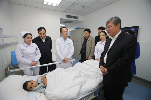 在二附院调研时,高发水参观了二附院南湖院区和七道湾院区,详细了解了南湖院区正在建设的二期工程进展情况,并听取了医院发展情况的汇报。高发水说,二附院领导班子能够抓住省部委共建、对口援疆和新疆建设丝绸之路经济带核心区医疗服务中心等发展战略的机遇,找准医院发展定位,通过和中亚国家积极开展交流,体现了医院抢抓机遇积极进取的时代精神。医院要在办好综合诊疗的前提下突出特色专科,在学科建设上多下功夫,只有通过提高医院的核心竞争力、提升诊疗服务能力、增强辐射功能,才能赢得群众的认可。要通过建立一套能够充分调动职工积极性的良性机制,留住人才、吸引人才,打出好医生这个“金字招牌”。同时要进一步探索“医养结合”的发展新路,把握当前我国老龄化社会的需求趋势,学习和借鉴国内的成功模式,在实现养老产业和医疗服务的有效衔接上,趟出一条健康产业的发展之路。