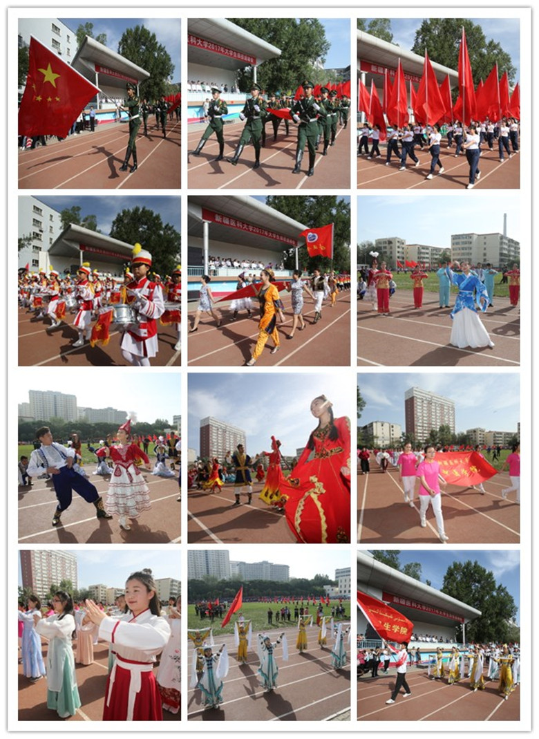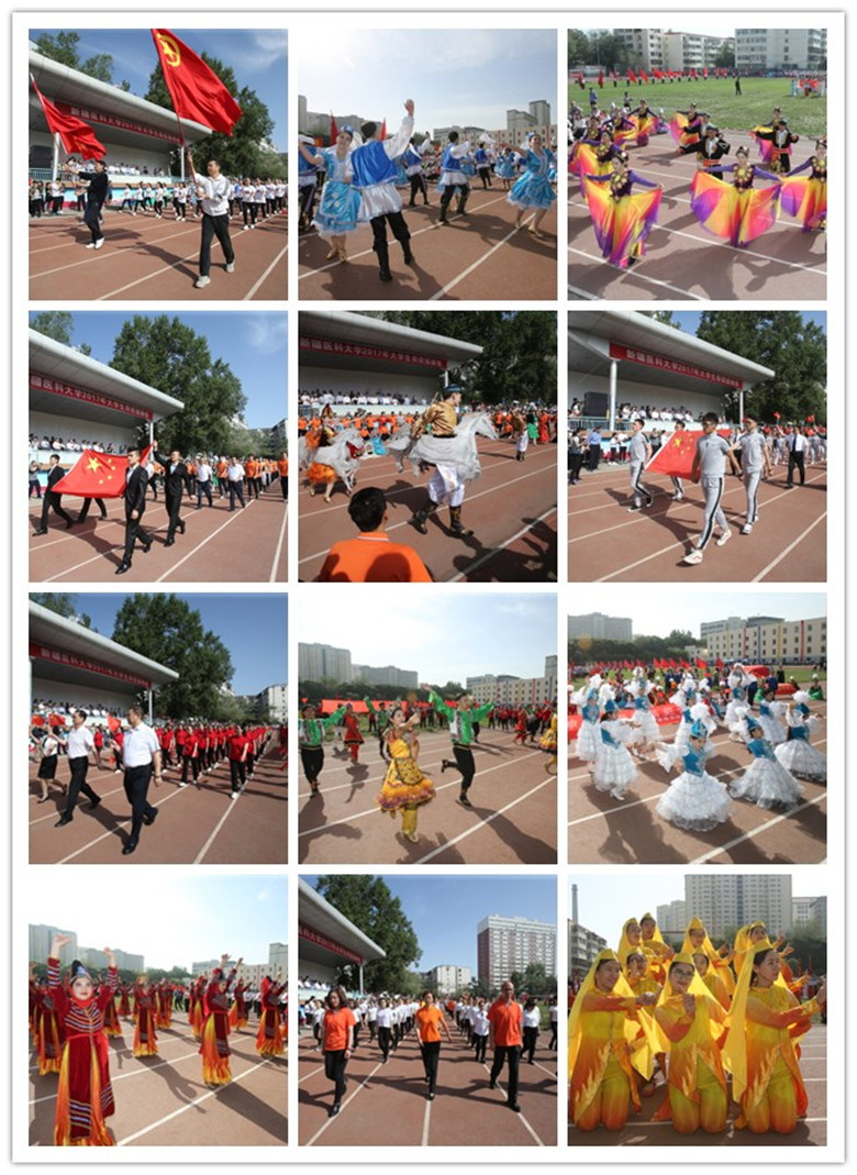 开幕式在“国旗仪仗队”壮严威武的飒爽英姿中拉开帷幕,校旗队、红旗队、子校孩子们的鼓号队率先通过了主席台,接下来,代表着13个民族的各学院方阵把偌大的体育场变成了一个民族大花园,临床医学院、中医学院、公共卫生学院、药学院、研究生学院、基础医学院、医学工程技术学院、护理学院、语言文化学院、维吾尔医学院、口腔医学院的师生们迈着整齐的步伐,英姿勃发的走过主席台,身着各民族服饰的学生们载歌载舞,展示了beat365唯一官方网站民族团结大家庭的和谐美好。最后出场的国际教育学院留学生方阵,也以其独特的异域文化为运动会开幕式增添了一抹亮丽的色彩。