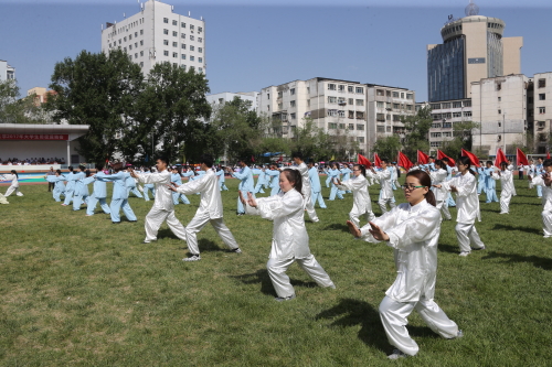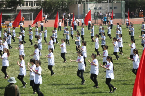 校长凯赛尔·阿不都克热木宣布运动会正式开幕。接着,开幕式大型太极拳、团体操、健康操表演,让运动场上的激情和热情再次升温。