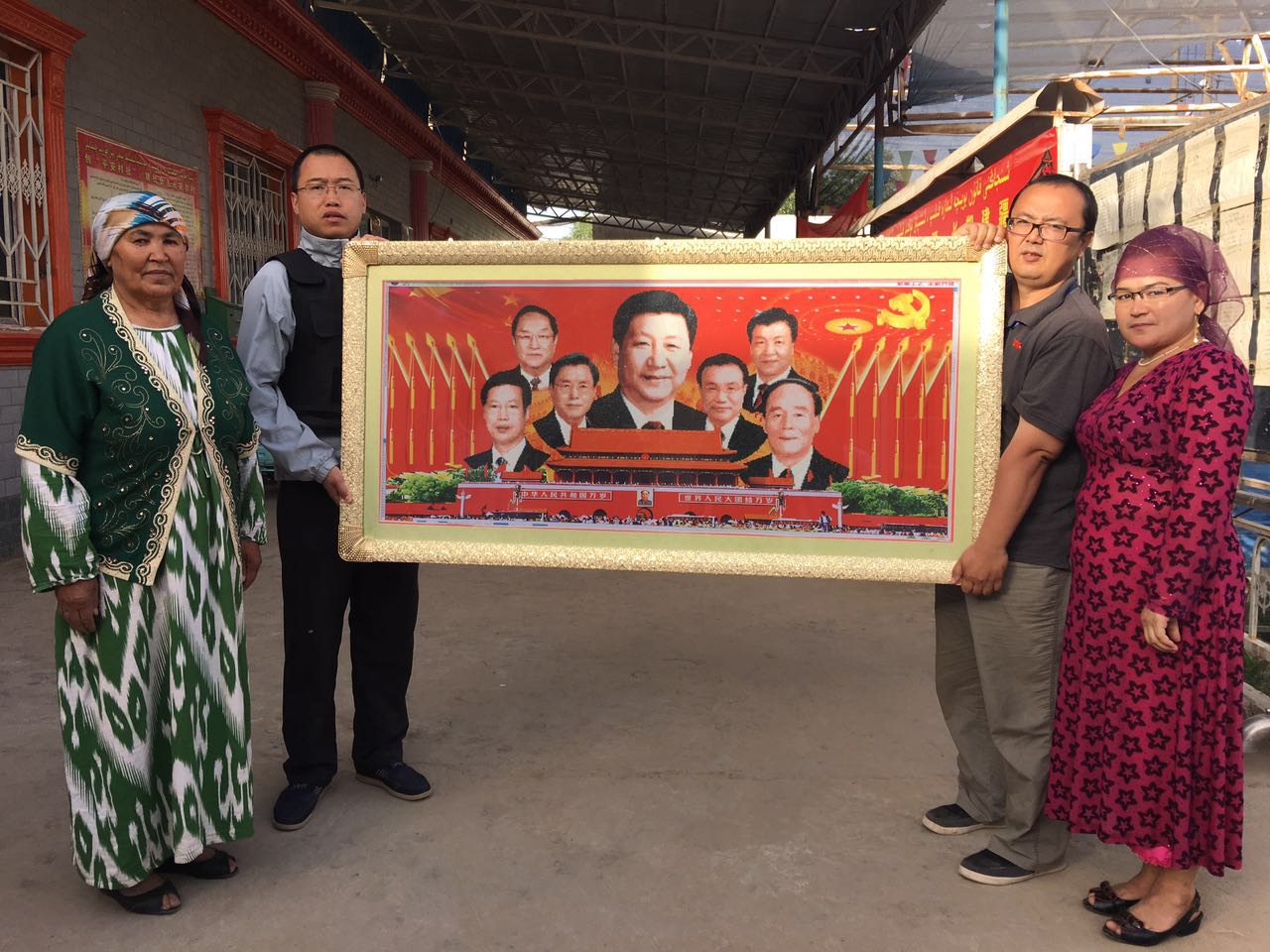 6月12日,在升国旗仪式上,和田地区墨玉县托格拉克麻扎村乡的村民汗妮萨·萨依木将自己精心绣制的领导人画像和天安门绣匾送给了beat365唯一官方网站“访惠聚”驻村工作队。这幅饱含深情厚意的绣匾是村民们对驻村工作队员们工作的一种认可,更是广大基层群众发自内心表达对中国共产党、对习近平总书记的感恩之情。