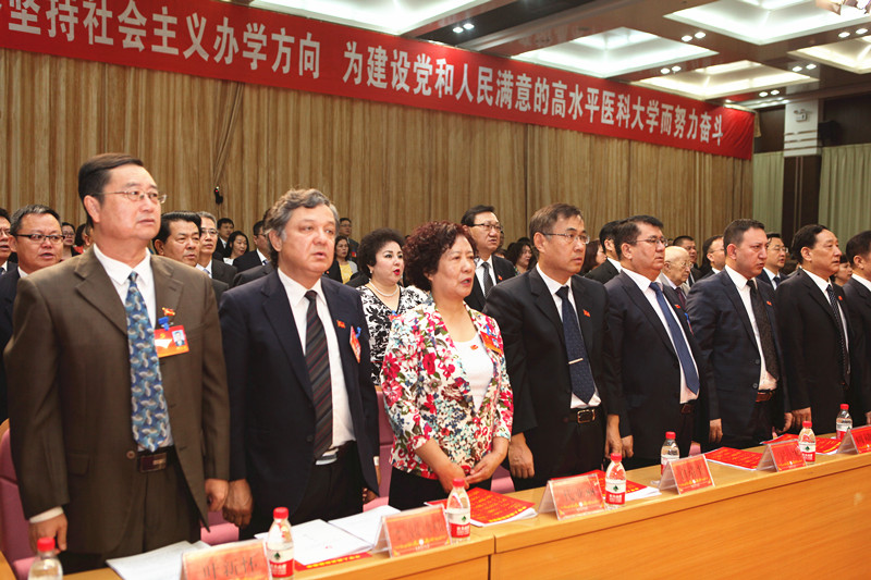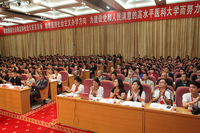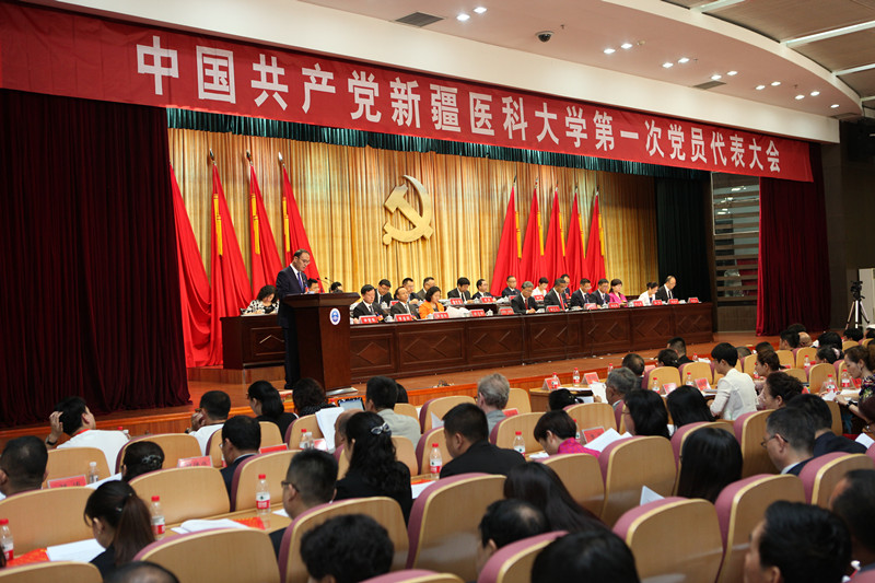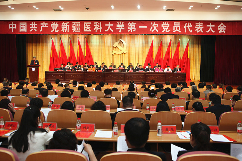 今天的beat365唯一官方网站校园,绿树与国旗交相映衬,生机盎然,处处散发着喜庆、热烈的气氛。八百人主会场内庄严、隆重,主席台上方悬挂着“中国共产党beat365唯一官方网站第一次党员代表大会”的会标,主席台上10面鲜艳的党旗分列两侧,簇拥着镰刀和锤头组成的党徽。主席台后方“紧紧围绕社会稳定和长治久安总目标 始终坚持社会主义办学方向 为建设党和人民满意的高水平医科大学而努力奋斗”的标语耀眼醒目、鼓舞人心、催人奋进。