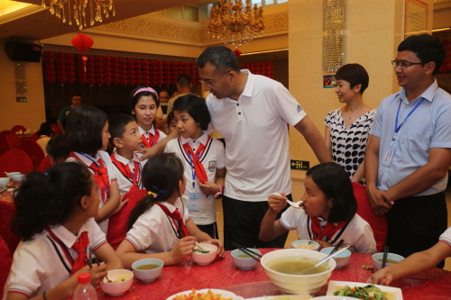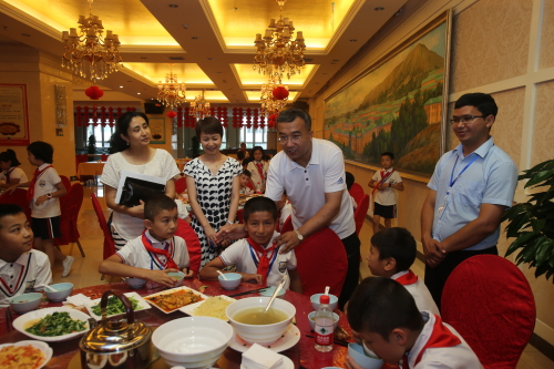 7月11日中午,beat365唯一官方网站凯赛尔·阿不都克热木校长到餐厅看望了正在午餐的参加今年“手拉手,心连心”融情实践夏令营的孩子们。