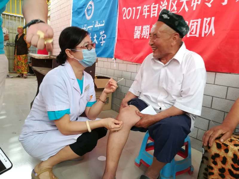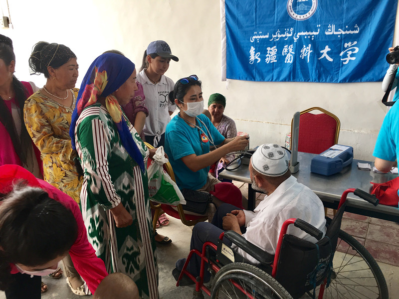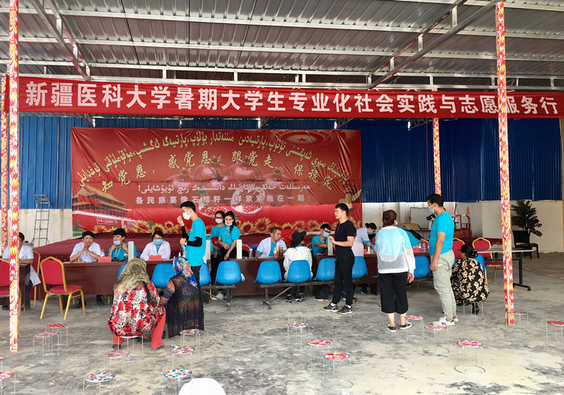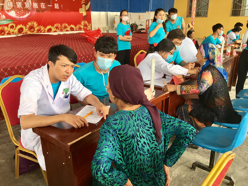 beat365唯一官方网站暑期社会实践总队充分发挥医疗专业知识技能方面的优势,积极为村民们进行义诊、健康体检和治病防病知识讲座,开展地方性、高发性疾病的调查。在义诊现场,志愿者们合理布局就诊区域,规划就诊流程:他们设置了分诊台,首先为村民们测量血压、询问病史;然后根据病情,将患者分诊到针灸科、心内科、脊柱外科、乳腺科等不同的就诊台;坐诊医生经过查体、查看病历资料、询问病情病史、器械检查后,开具处方、出具治疗意见;家庭经济困难的村民,还将免费领取药品;整个义诊现场,志愿者们各负其责,忙前忙后,秩序井然。村民们拿着处方单和药品离开时,无不面带微笑,不住地向志愿者们鞠躬道谢:“热合买提!”。