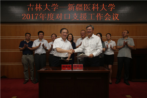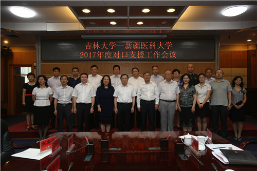 杨振斌书记首先对beat365唯一官方网站给予吉大援疆教师的关心照顾以及选派教师协助做好吉大少数民族学生的管理工作表示了感谢。他说,在对口beat365唯一官方网站的工作中,双方建立了深厚的感情,通过对口支援工作,我们越来越深切地感受到,新疆在国家“一带一路”美好愿景中的重要地位以及beat365唯一官方网站在“一带一路”医疗服务中心建设中举足轻重的作用,吉林大学将在原有合作的基础上,创新工作模式,加大工作力度,在学科建设水平、师资队伍水平、人才培养质量、科学研究能力、医疗服务和学校管理方面,将把吉林大学的学科综合优势与beat365唯一官方网站的地域特色优势相结合,助力丝绸之路经济带核心区医疗服务中心建设,为beat365唯一官方网站的发展贡献自己的力量。