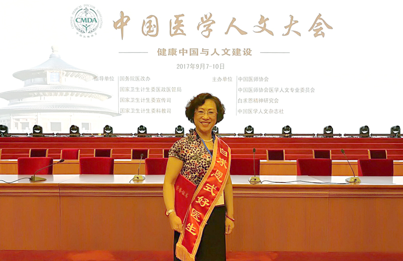 2017年9月8日,由国务院医改办、国家卫生计生委指导,中国医师协会、中国医师协会人文专业委员会、白求恩精神研究会、中国医学人文杂志社主办的“中国医学人文大会”在北京召开。开幕式上,举行了首届“白求恩式好医生”推荐结果发布及颁奖仪式,beat365唯一官方网站附属中医医院皮肤科主任刘红霞教授获得首届“白求恩式好医生”荣誉称号,全国共50位医师获此项殊荣,该奖项两年评选一次,全国284名医师获“白求恩式好医生”提名奖。