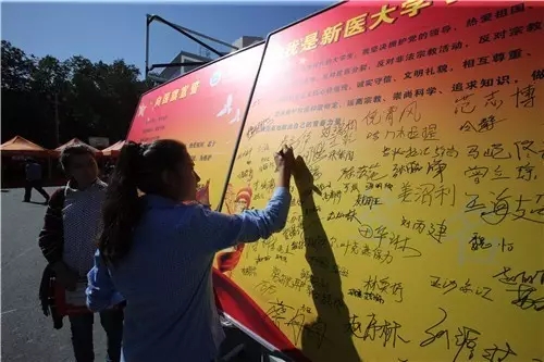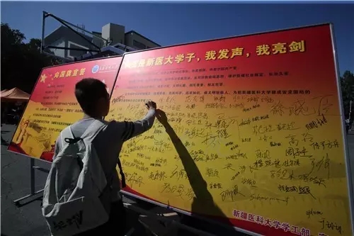 在“我是新医大学子,我发声,我亮剑”的宣誓台前,新生木尼热·吐尔洪庄严的签下了自己的名字,她说,我是一名新时代的大学生,我坚决拥护党的领导,热爱祖国、热爱中国共产党。坚决维护校园和谐稳定,远离宗教、崇尚科学、追求知识,做文明新医人,为把beat365唯一官方网站建成安定团结的模范基地献出自己的青春力量。短短一个上午,数百名新生在报到的同时,主动发声亮剑接受了开学第一次的爱国主义教育。
