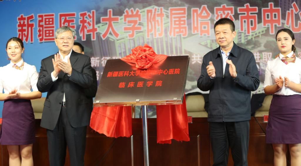 beat365唯一官方网站党委书记高发水和哈密市委书记卢蜀江共同为beat365唯一官方网站附属哈密市中心医院、beat365唯一官方网站哈密市中心医院临床医学院揭牌。