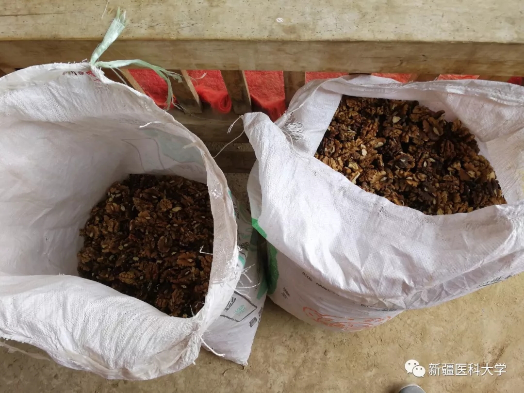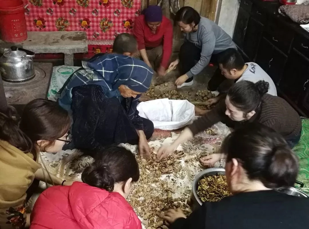 填饱肚子后,我们开始帮助巴克尔一家剥核桃。边干活边聊天,我们了解到,剥一公斤核桃仁可以换1.5元的手工费,可看看时间,我们辛苦了两个小时,也只能为亲戚带来7.5元的收入。虽然大家都已经腰酸背痛了,但我们一致决定,必须剥完75公斤的核桃,不然就不吃晚饭了!一番努力之后,三大袋子的核桃仁终于被我们剥出来了。