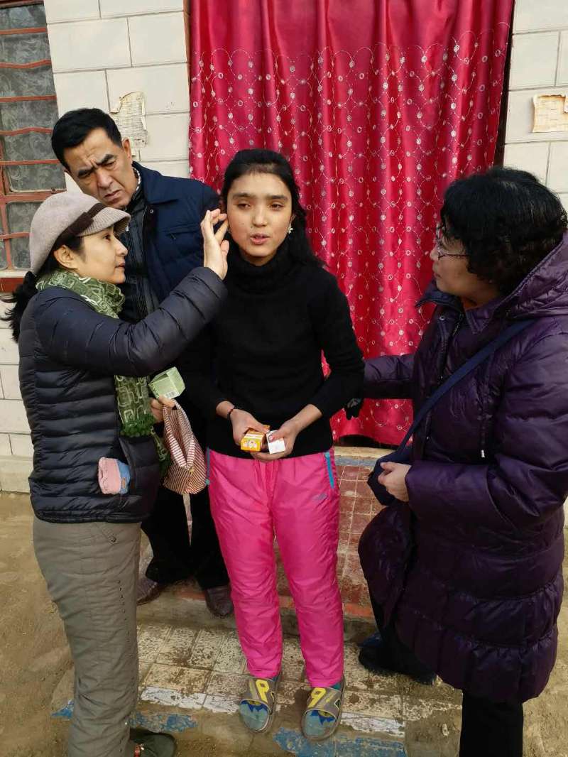 帕提古丽的左耳有中耳炎,致使听力逐渐下降,手部也有湿疹。结亲干部不仅给女孩带来了漂亮的衣服,还送给她治疗湿疹和中耳炎的药物,希望女孩早日康复。