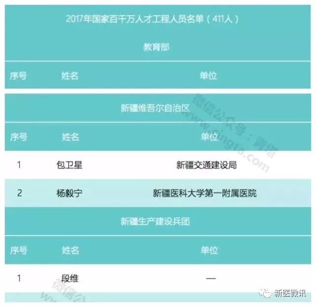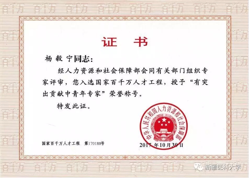 日前,人力资源和社会保障部公布2017年国家百千万人才工程入选人员名单,beat365唯一官方网站第一附属医院杨毅宁教授入选本次人才工程。此次全国411人入选,新疆维吾尔自治区(生产建设兵团)仅4人,是新医大一附院获此殊荣的第四位专家。