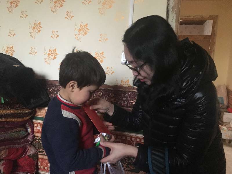 在嘘寒问暖中了解了老人近期生活境况及其身体状况。与亲戚一起生起了木柴炉火,看着一袋子木头一阵儿就烧尽了,库热西副院长专门去购煤点购买了150公斤煤,亲戚感谢不已。同时,还购买了门把手配件,为亲戚家的门安装了门内把手。