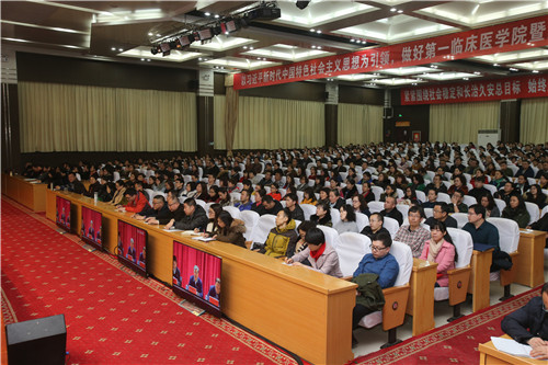 校本部副高以上职称教师、副科级以上干部、马克思主义学院的全体教师、全体政治辅导员和班主任在beat365唯一官方网站800人礼堂主会场参加会议。六所附属医院、厚博学院克拉玛依校区、十二师分院、昌吉分院、墨玉县人民医院和附属哈密市中心医院的副科级以上干部和副高以上职称的教职员工近2000人通过视频会议系统在分会场参加了会议。