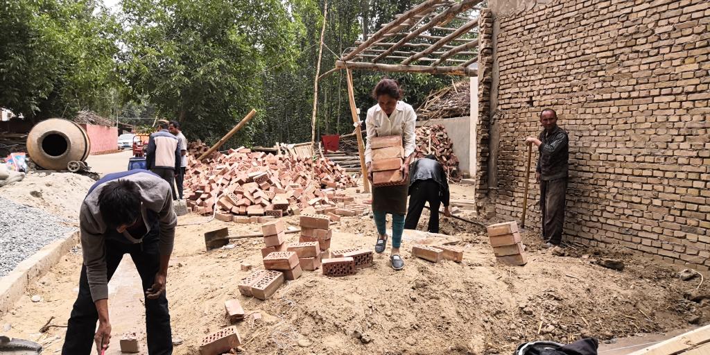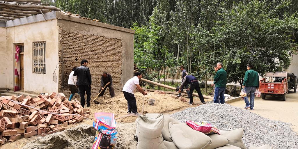 5月22日,墨玉县扎瓦镇托格拉克村骄阳似火,图然妮萨•如则麦麦提家的庭院里呈现出一派热火朝天的劳动场景,大家齐心协力把图然妮萨•如则麦麦提家的厨房、围墙都搭建起来了,正在着手进行的庭院改造工程将让这里焕然一新。