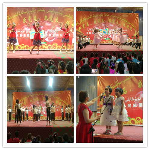 庆祝活动在《我们在新疆》的欢快舞蹈中拉开了帷幕,演讲《感谢祖国妈妈》、诗朗诵《中华民族一家亲》、小合唱《读书郎》、健美操《哇卡哇卡》、才艺展示等小朋友自编自导的节目,一次又一次将活动推向高潮,特别是当“人之初,性本善;性相近,习相远;”的朗朗读书声响起的时候,台上台下一个声音,观众席也成为了表演的舞台,大家一起诵读国学经典《三字经》,传达着“仁,义,诚,敬,孝。”的国学精神。孩子们用自己稚嫩的声音、欢快的舞蹈表达着对伟大祖国的认同,对中华文化的认同。阵阵的掌声是对库提热木小学积极向上的精神面貌的肯定,是对一年来优秀传统文化教育取得丰硕成果的肯定,也是向开展南疆双语支教工作交上的最好答卷。