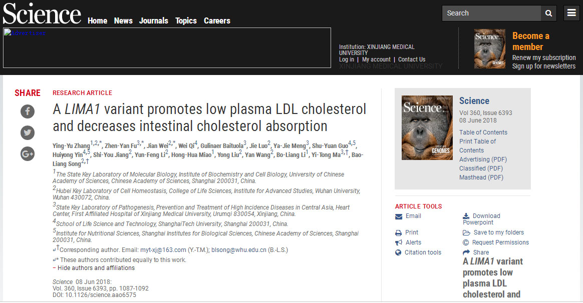 近日,国际学术期刊《Science(科学)》杂志正式发表了beat365第一附属医院马依彤教授与武汉大学生命科学学院宋保亮教授的最新合作成果,论文题目为《A LIMA1 variant promotes low plasma LDL-cholesterol and decreases intestinal cholesterol absorption》。