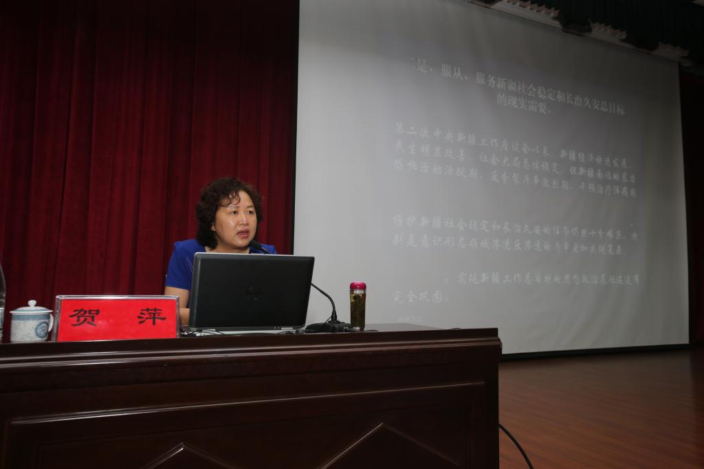 贺萍教授围绕深入贯彻落实习近平总书记关于新疆工作总目标进行了深入解读。她运用历史唯物主义观点,旁征博引、深入浅出,正本清源、使全校教职工深受启发和教育,进一步澄清了模糊认识,明确了红线底线,增强了广大干部职工的“免疫能力”。