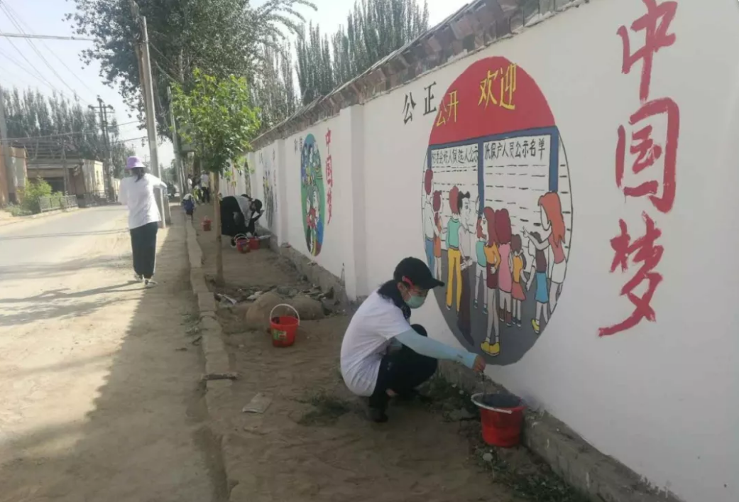 在墙体绘制现场,青岛美术学院的师生们有的在调配颜料,有的拿着画笔,细致着色,一幅幅或美轮美奂、或气势恢宏、或饱含寓意的绘画逐渐呈现出来,昔日单调的墙面,顿时装扮成了充满艺术气息的“文化墙”,让人眼前一亮。青岛大学美术学院室内设计专业大三学生孙海洋谈到:通过墙体绘画,让这里的百姓们感受来自山东青岛,来自祖国东部不一样的风景,同时通过文化展示墙和传统美德传播墙,以一种喜闻乐见的方式,让广大群众广泛了解和学习中华民族的优秀传统文化,引导群众树立正确的人生观、价值观。