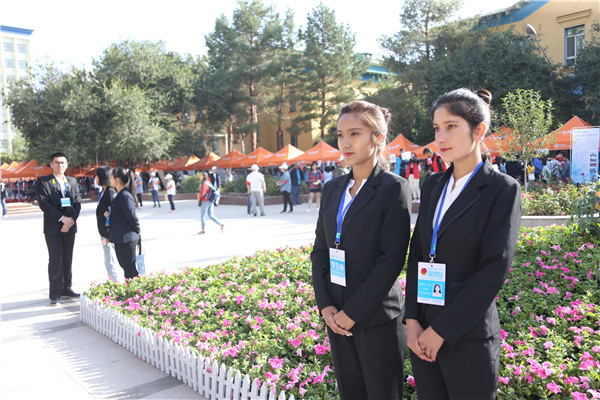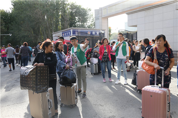 学校各级部门相互协作,多措并举,精心部署。报到当天,学校在乌鲁木齐新客站、火车南站、碾子沟客运站等站点设新生接待站,派出10辆车8:00-17:00均有校车迎接,方便新生和家长的交通出行;在学校入口及校园重要路口设置地图及指示标志,便于新生熟悉校园环境和楼宇位置;设置2018年迎新咨询处综合协调迎新工作,保障迎新工作顺利进行。为了进一步畅通师生联络,方便学生及时了解学校迎新信息,学校通过微信平台、学院微信群发布入学信息,解答家长困惑,服务全体新生。各相关部门、学院负责人及服务人员和150名志愿者在迎新现场为新同学们提供咨询、引导、行李搬运等各种服务。学校还在葡萄长廊设置了家长休息区,为家长准备了热的饮用水,让大家在入学第一天就感受到学校大家庭的温暖。