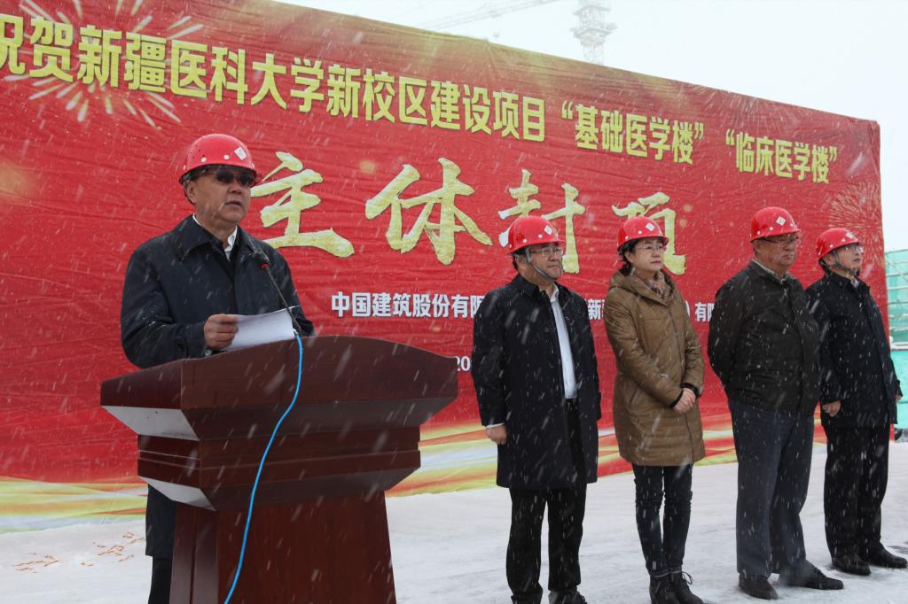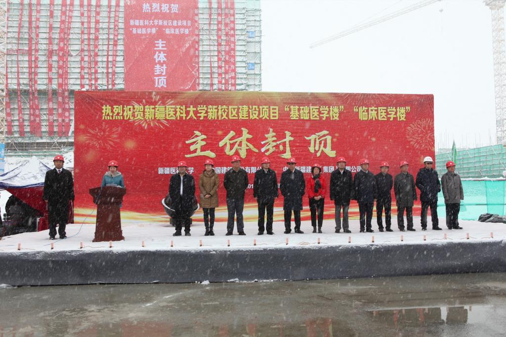 新疆建筑设计研究院领导、新疆华优建筑设计院领导、中建新疆建工集团领导、中建新疆西部建设集团领导、beat365唯一官方网站全体在家校领导、各学院(附院)党政主要负责人、各职能处室负责人、新校区建设指挥部全体成员、基础医学院和临床医学院教职工代表,各学院(附院)教师代表和医务人员代表,施工单位、监理单位代表共同见证了这一荣耀的时刻。
