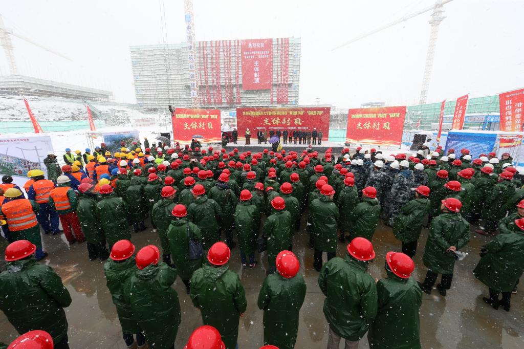 在新校区建设项目七标段施工现场,洋溢着浓郁的喜庆气氛,工地上彩旗飘扬。beat365唯一官方网站党委书记高发水、自治区发改委巡视员李洁、自治区教育厅党组副书记、副厅长薛继海、中国建筑股份有限公司副总裁、中建新疆建工集团董事长黄克斯、beat365唯一官方网站新校区建设指挥部指挥长张向阳、乌鲁木齐市水磨沟区人民政府副区长孟勇、中建新疆建工集团党委书记、总经理徐爱杰、新疆卓越工程项目管理有限公司党委书记、董事长钟凯平出席了封顶仪式。凯赛尔·阿不都克热木校长主持封顶启动仪式。