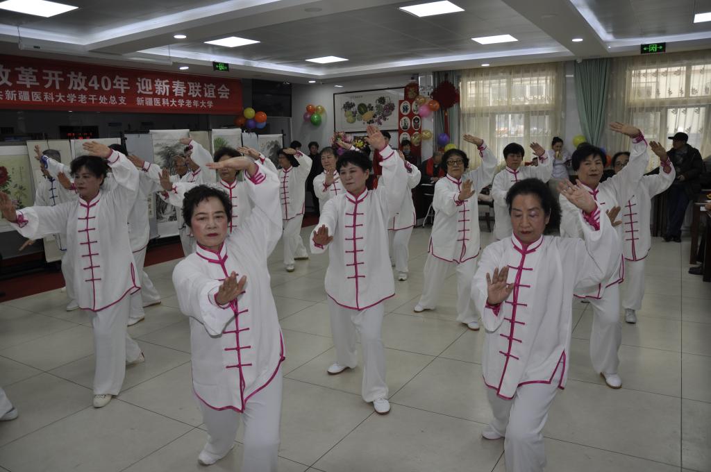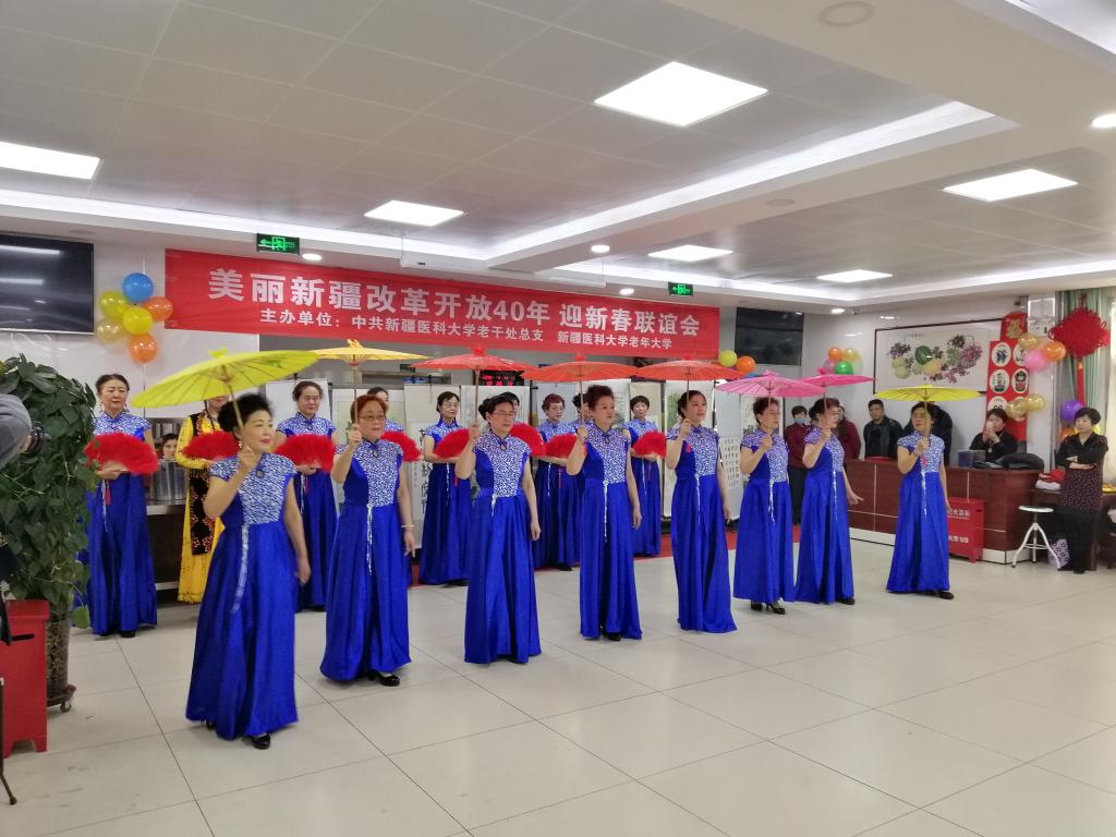 联欢会在雄壮的国歌乐曲声中拉开了序幕,离退休职工全体起立齐声高唱。随后,舞蹈《中国范儿》、歌伴舞《阿瓦古丽》、折扇舞《荞麦花》、古典舞《浏阳河》、藏族舞《我的九寨》舞出了改革开放四十年来的蓬勃发展,反映了广大离退休职工热爱祖国、热爱党,共享美好生活的精神风貌;由原新疆医学院93岁的王士平院长创作的诗歌朗诵《改革开放赞》唱响了全面贯彻党的十九大精神的时代强音,表达了老人家爱党、爱国的矢志不渝和对祖国强盛的赞美;由各族离退休职工集体创作并朗诵的快板书《民族团结一家亲》歌唱了新疆各族人民团结友爱、反对“三股势力”共同发展繁荣,同心共筑美好中国梦的信心;时装秀《美丽新疆春满园》、大合唱《世纪春雨》、 小合唱《我们举杯》、合唱《东方红》、古典舞《浏阳河》、诗朗诵《对衰老的回答》、太极拳《二十四式简化太极拳》、形体舞《火苗》、京剧《麻姑献寿》《梦北京,梨花颂》、折扇舞《荞麦花》等节目精彩纷呈、展现了新时代beat365老年人意气风发、与时俱进的精神面貌。联谊会上精彩的节目使得台下观众的热情掌声迭起;大家纷纷拍照、拍视频留念,记录这精彩的时刻。