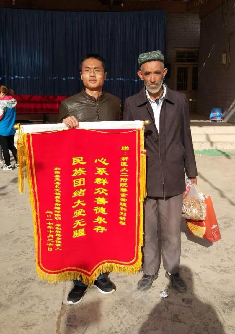 当年10月21日,当布萨依普•伊敏出院时,刘新福专门到火车站为她买了和自己去墨玉县结亲的同一趟列车,亲自把她送回家。在回家的路上,医院结亲队员们集体照顾她们,拿行李的拿行李,推轮椅的推轮椅,送吃的送吃的,经过一天的行程她们回到了英吾斯塘村的家和亲人们团圆了。伊敏•库尔班特地准备好了一面印有“心系群众、善德永存,民族团结、大爱无疆”字样的锦旗在英吾斯堂村村委会结对认亲活动现场送给了刘新福,伊敏•库尔班感动地哭着说:“女儿在乌鲁木齐看病期间,刘新福为我女儿的事情跑前跑后,在吃、住、行上都考虑的非常周到,他还带自己的妻子、女儿来病房看我们,我们就像一家人一样。女儿通过手术已经可以走路了,我要代表全家感谢beat365唯一官方网站“访惠聚”驻村工作队,感谢二附院领导、专家团队治好了女儿的病,你们都是好样的!”