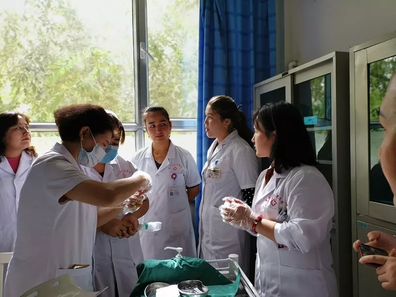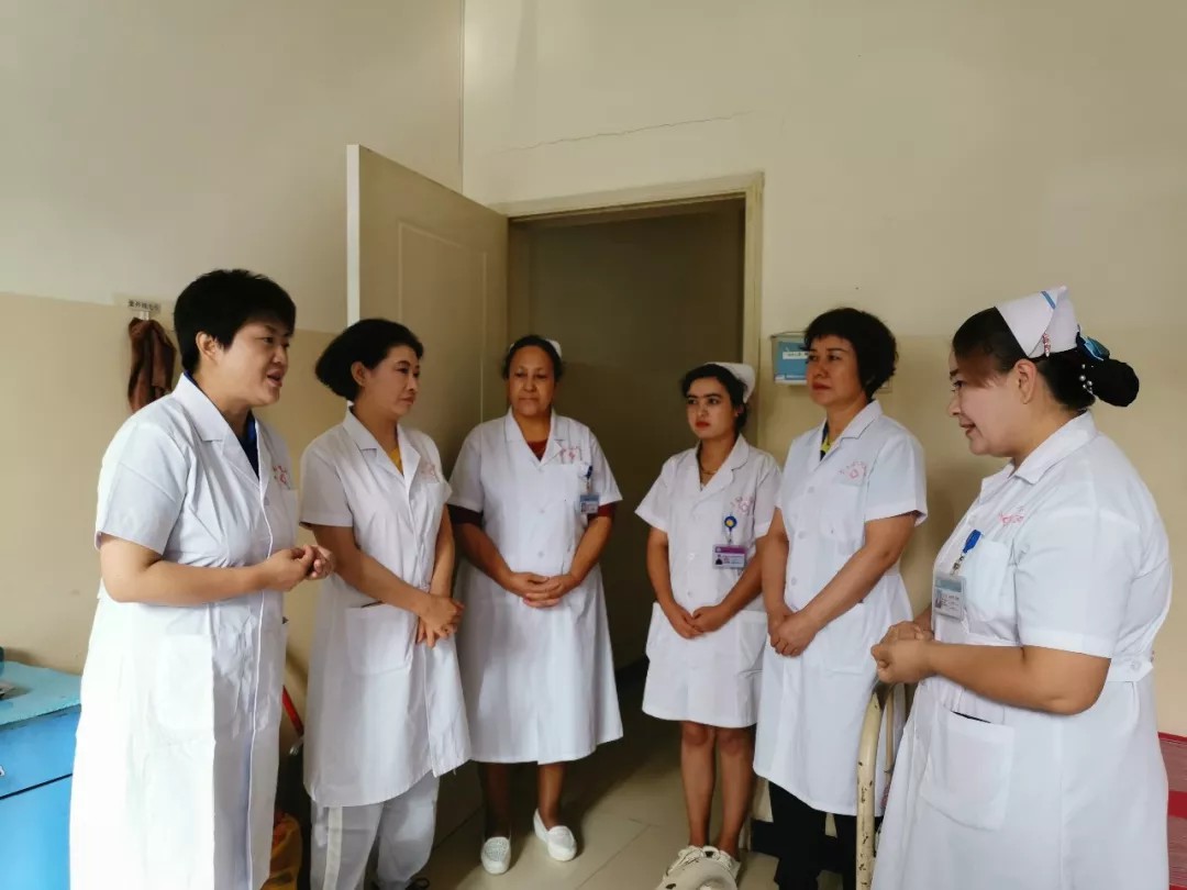 与此同时,妇科护士长谢群、骨三科护士长杨莉、妇科主管护理师王红梅在墨玉县人民医院妇科护士长的引导下行护理查房,对护士站治疗室、理疗室、检查室进行了查看,对医疗护理、中药用药的具体操作手法进行了详细指导。