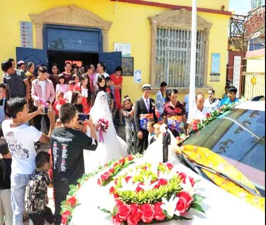 中午,一对新人坐上婚车,在亲朋好友的祝福下前往阿克塔木村村委会。大家纷纷拿出丝巾和水果送去祝福,一条条象征幸福的彩色丝巾披满了新人的双肩,整个村子充满了浓浓的民族团结情。随后,大家跳起了欢快的麦西来甫,现场成了欢乐的海洋,参加婚礼的亲朋好友纷纷拿出手机,定格这温馨的时刻。